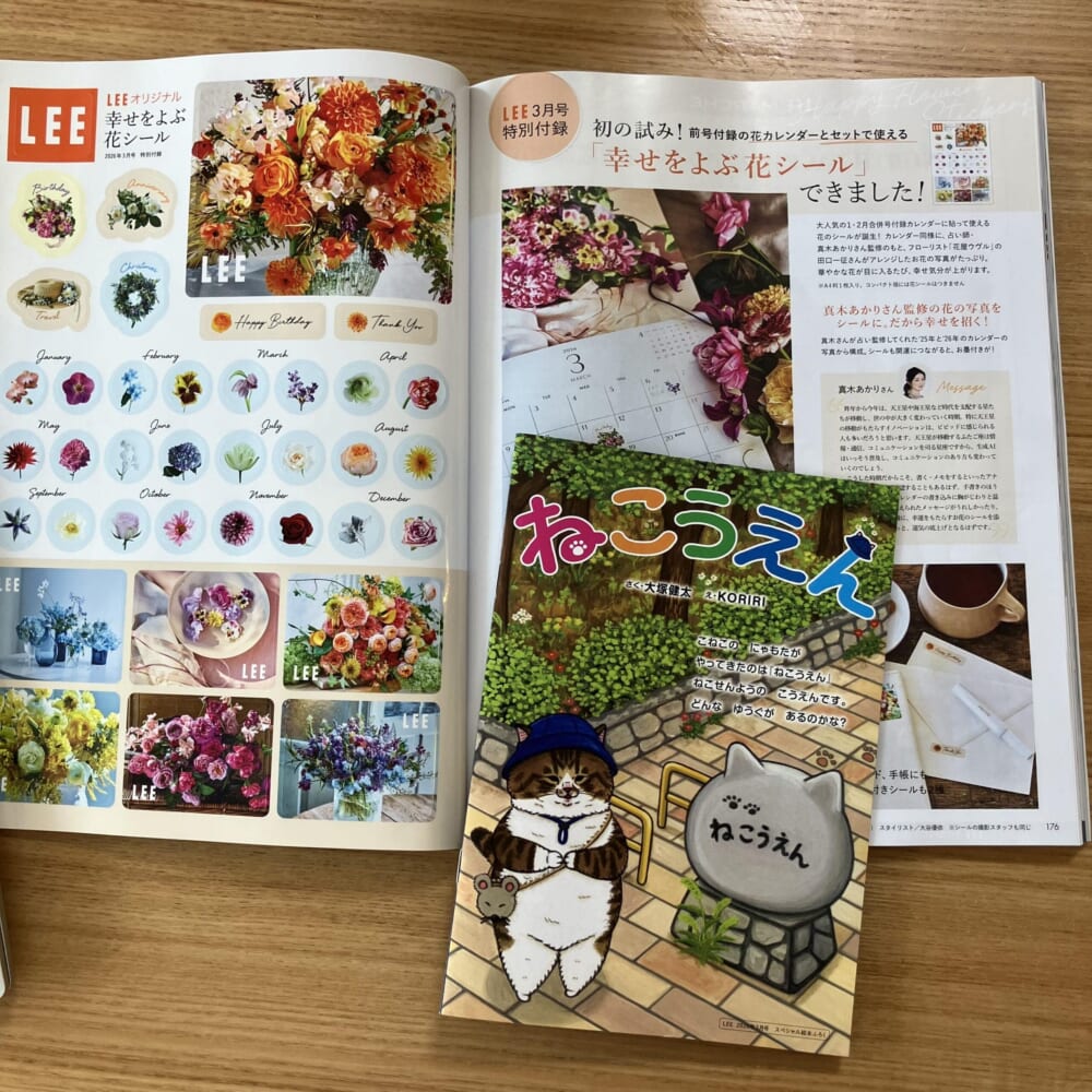 今月号は大塚健太さんの絵本「ねこうえん」と幸せをよぶ花シールの2つの付録がついていて嬉しい。