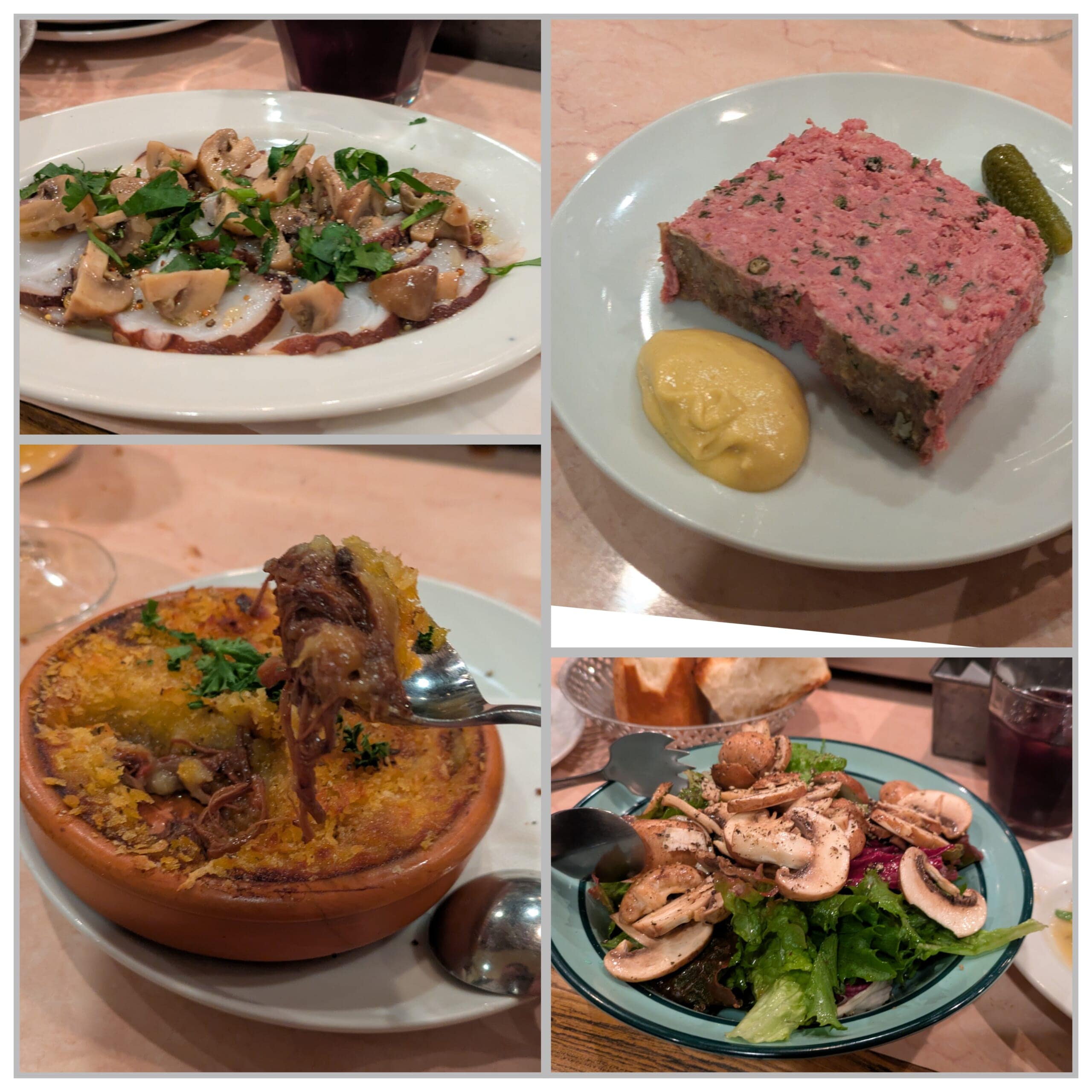 他にも、キノコたっぷりのサラダや、お肉の旨みが凝縮されたパテ、そして熱々のパルマンティエ(牛肉の煮込みとマッシュポテトのグラタン)。合わせたワインも進んでしまいました!