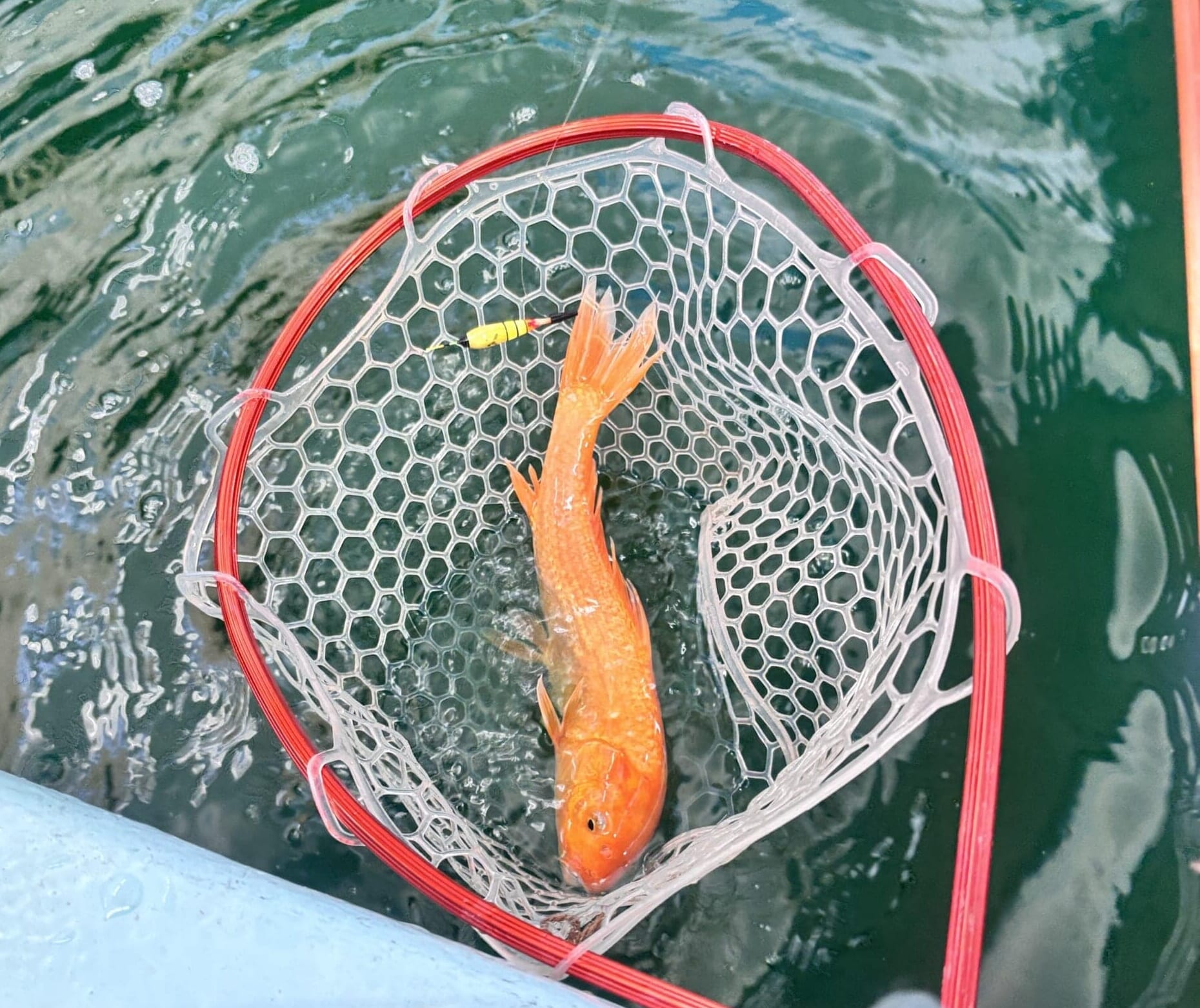 鯉やフナが釣れ、網ですくってすぐ逃し何匹釣れたかを楽しみます。