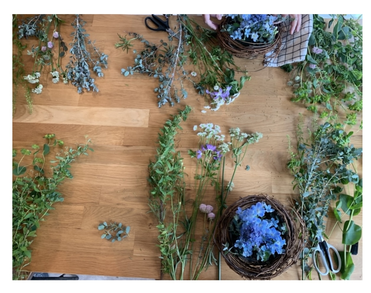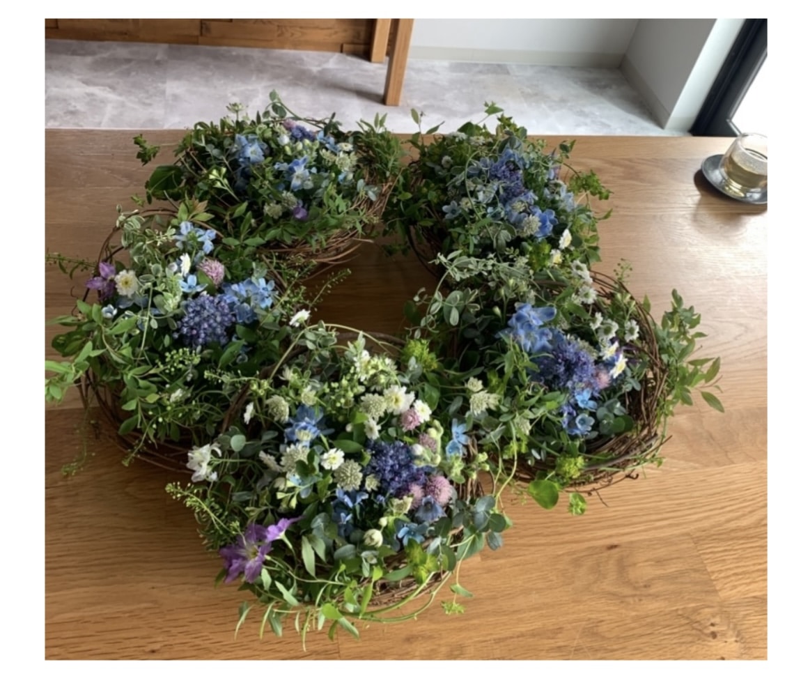 やはり作る人によって、全然違いますよね!それぞれの思いが詰まった季節のリースが出来上がりました。涼しげなブルーベースのカラーが気持ちもすっきりとさせてくれます。