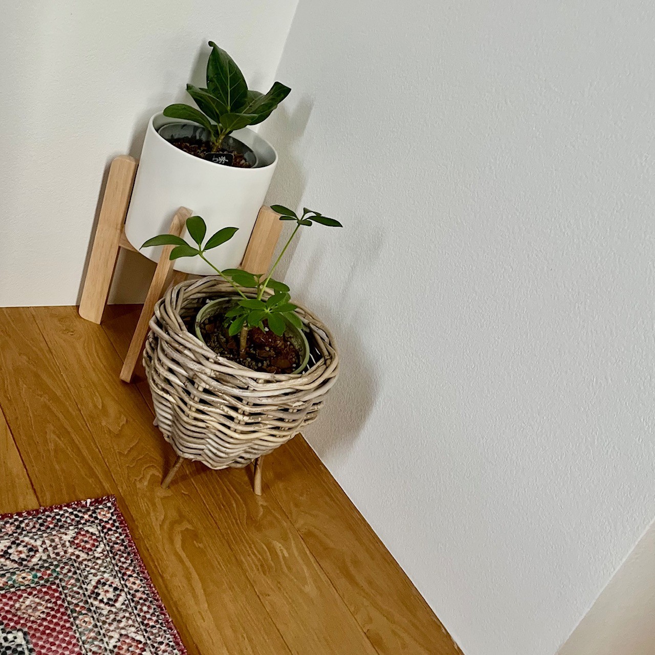 こちらも最近、購入して気に入っている籐の鉢カバーのお隣へ。