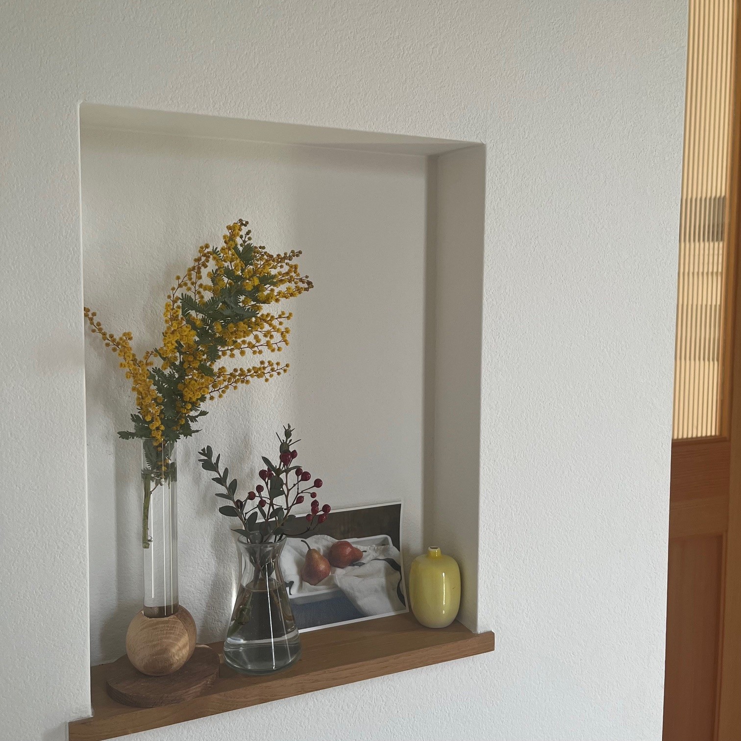 玄関のお気に入りスペースの棚にも飾ってみました♩ミモザの鮮やかなイエロカラーをポイントで差すだけでこんなにぱっと華やぐとは!花の効果って絶大ですね。