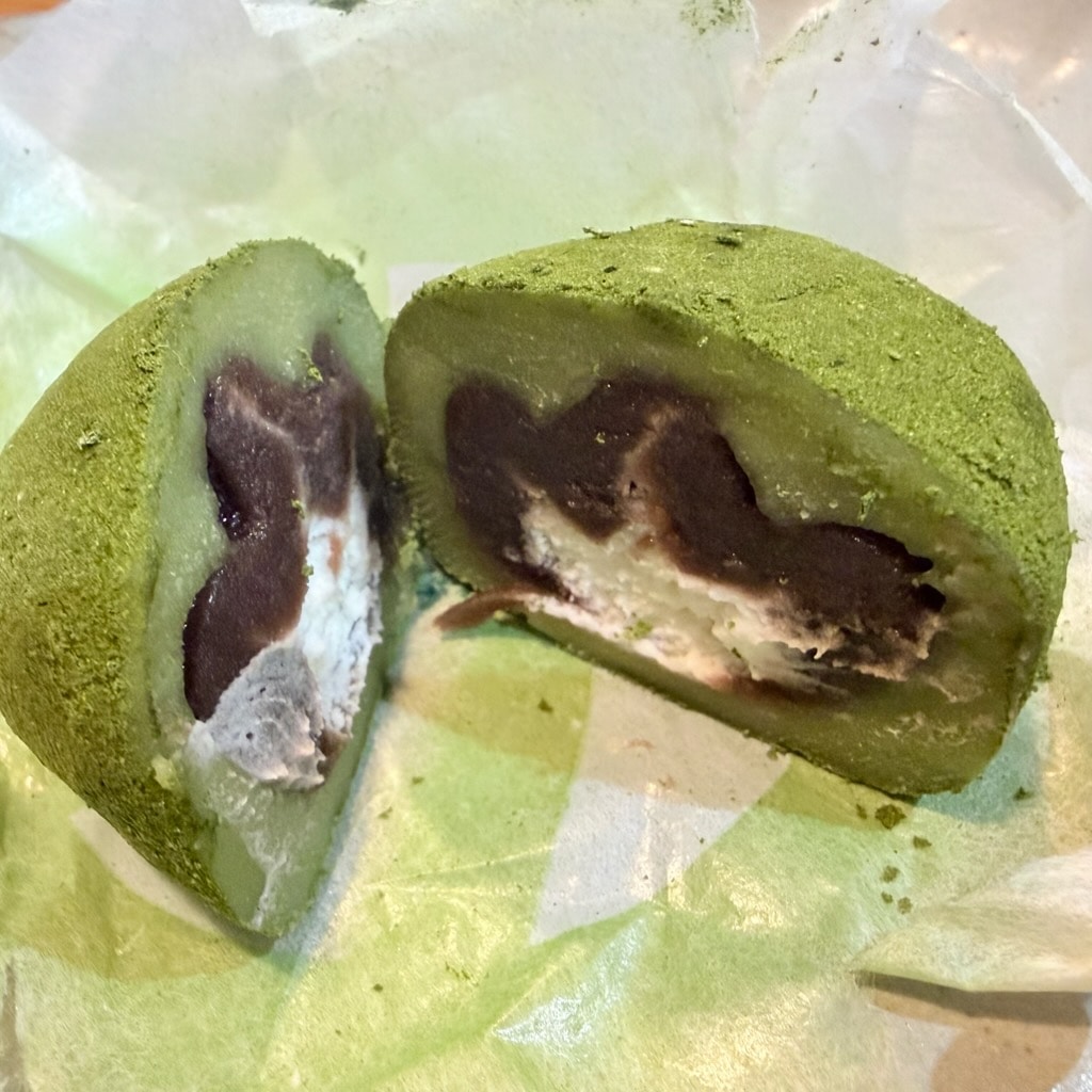 この大福は4重構造になっていて、中心にクリーム、そのまわりにこしあん、それらを抹茶を練り込んだ餅でくるみ、その上に1つずつ丁寧に抹茶がまぶされています。