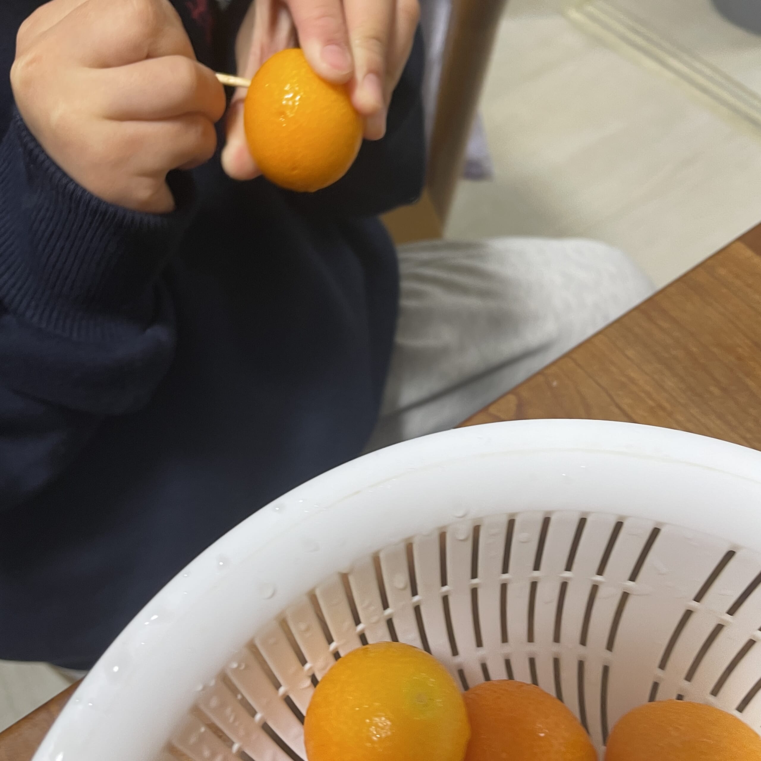 - 金柑を優しく洗い、ヘタを手で取る