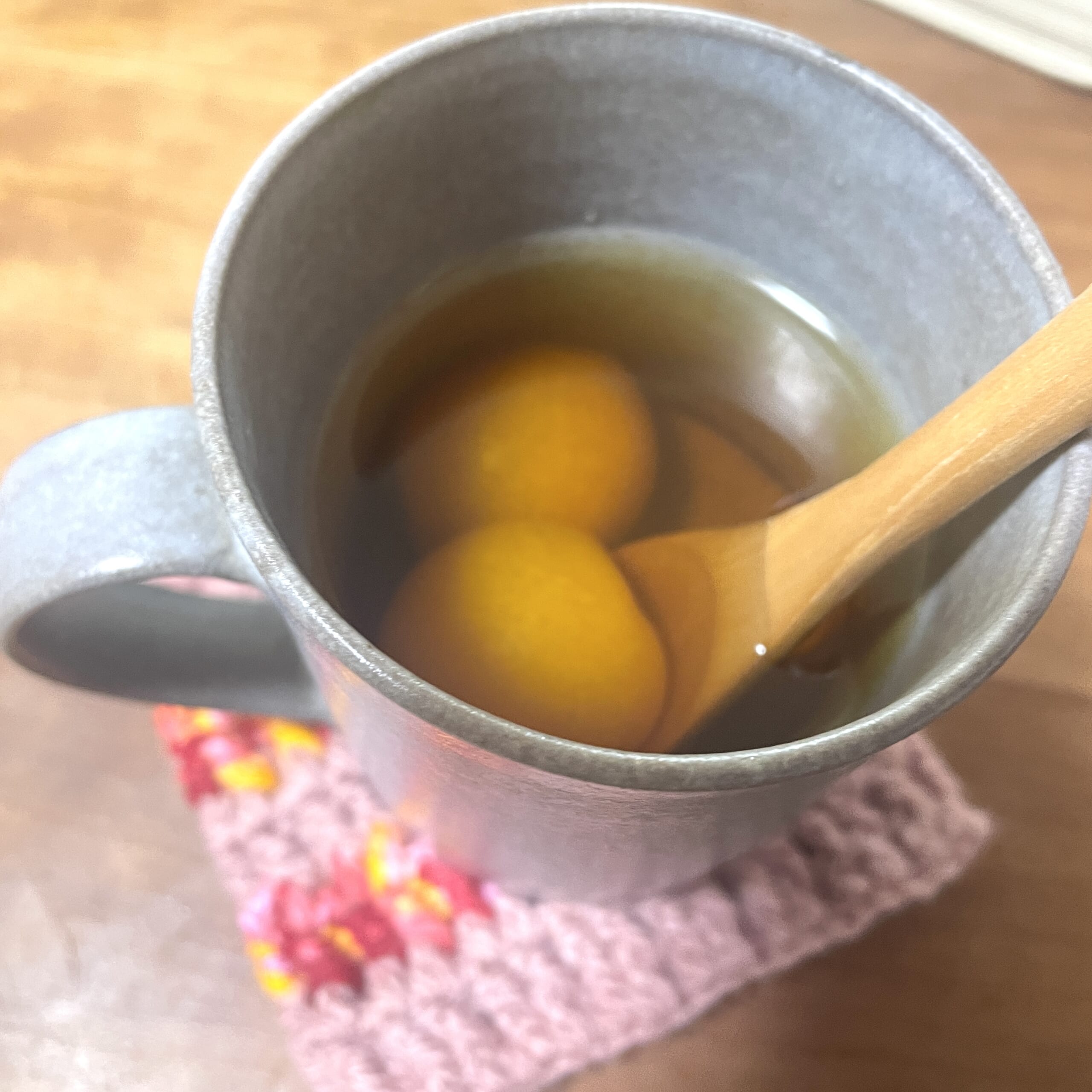 ほうじ茶200CC弱に、シロップを大さじ2杯入れ、金柑を2つ入れるのが、私の「黄金バランス」です。