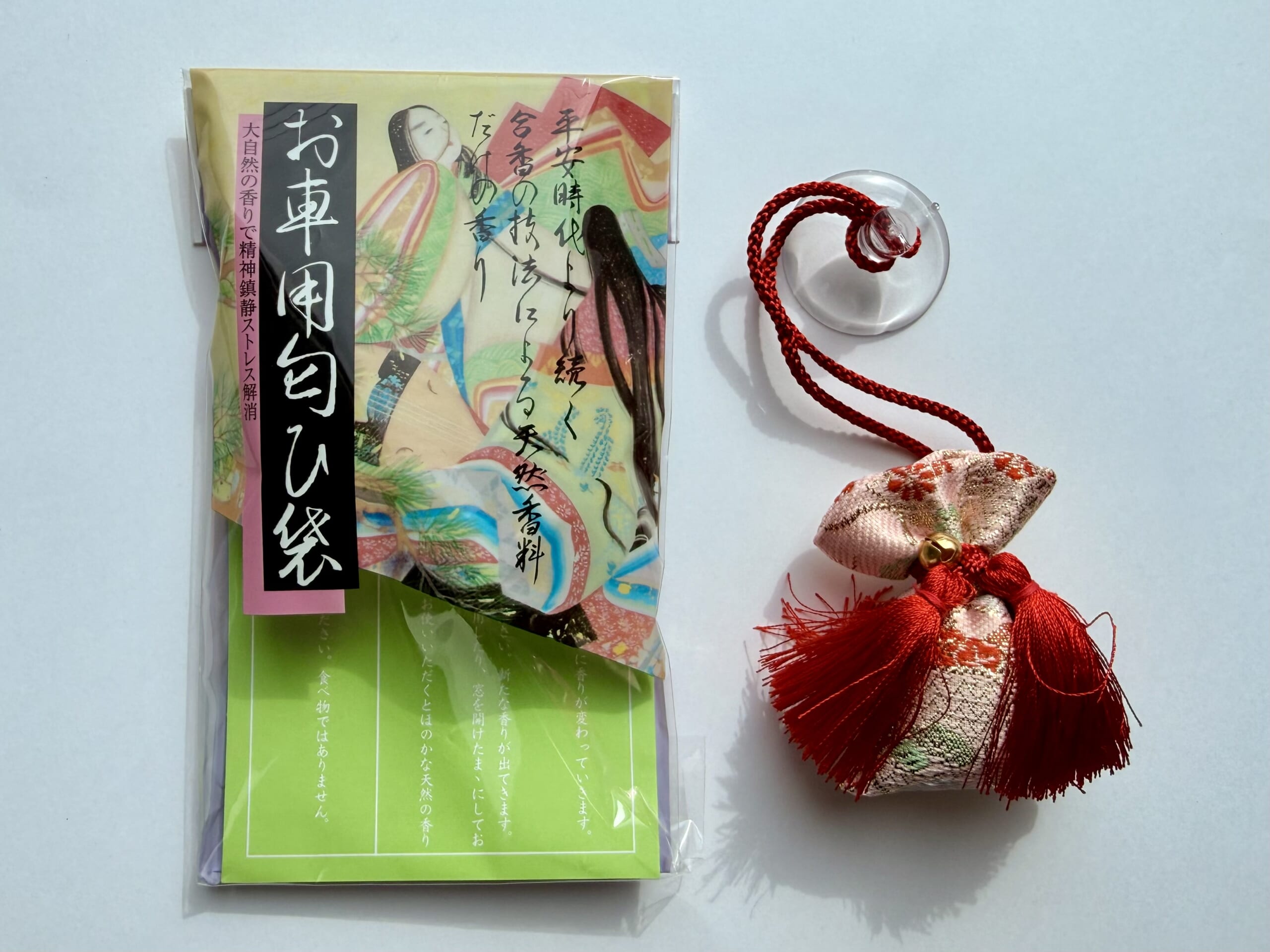 平安朝の頃から続く合香の手法で、白檀・丁子・大うい香等、十数種の天然香料を使った伝統の匂い袋を車用に仕上げたもの