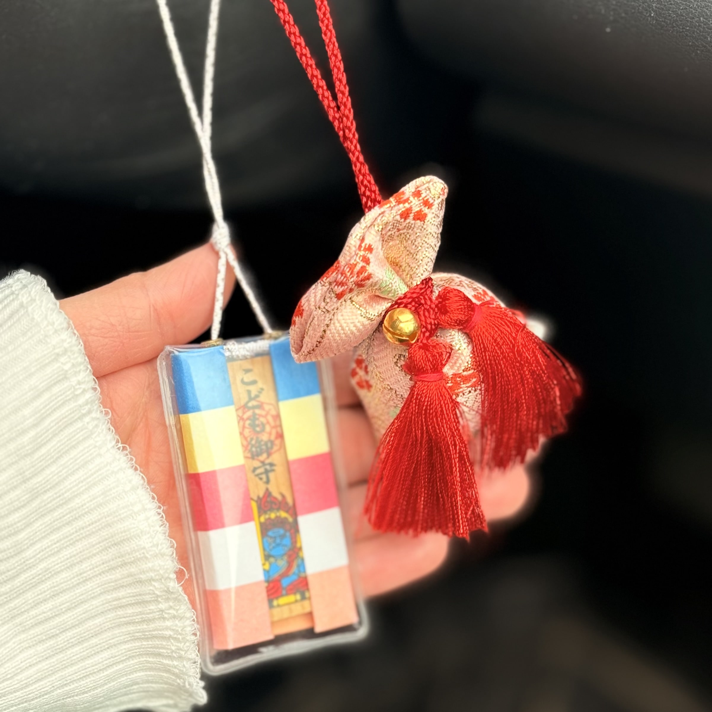 成田山のこども御守りと一緒に、ウインカーレバーへかけました。
