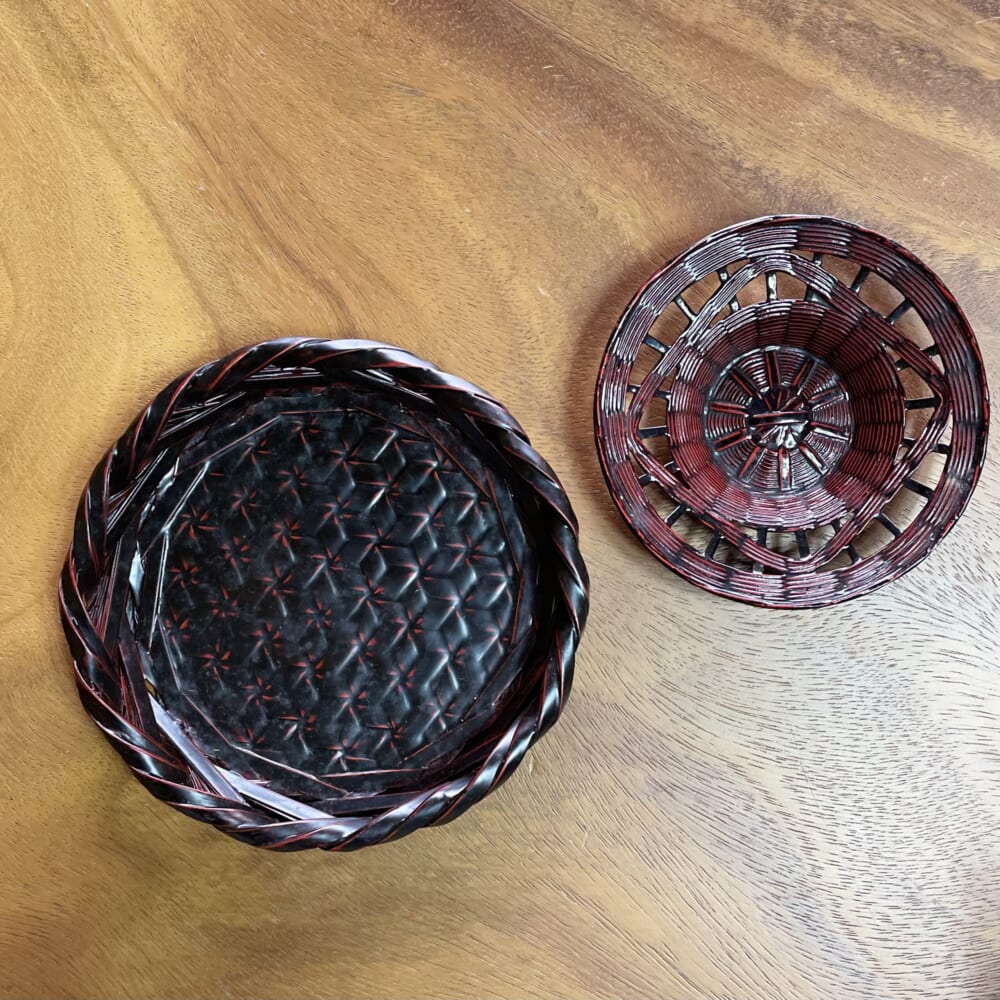 竹を編み上げ、塗りを何層も重ねて作られる。
