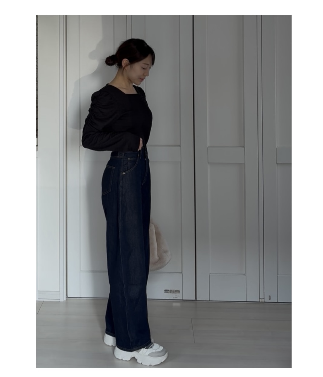 肩回りにボリュームがあるトップス×バギーカーブジーンズ◎