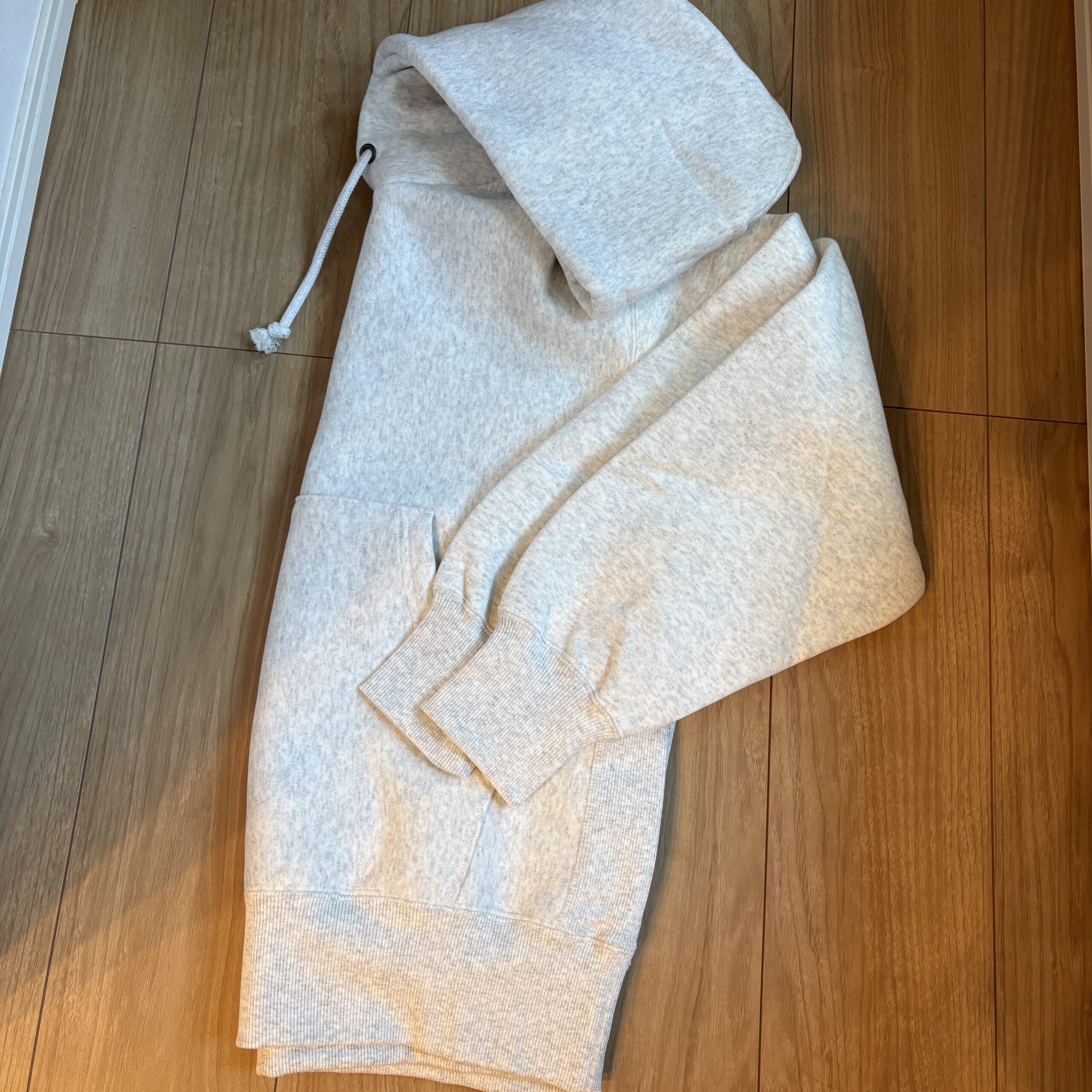 GUの「ヘビーウェイトスウェットパーカ」。肉厚な生地感がお値段以上で、大人のカジュアルに最適とのことで、惹かれるように購入しました。