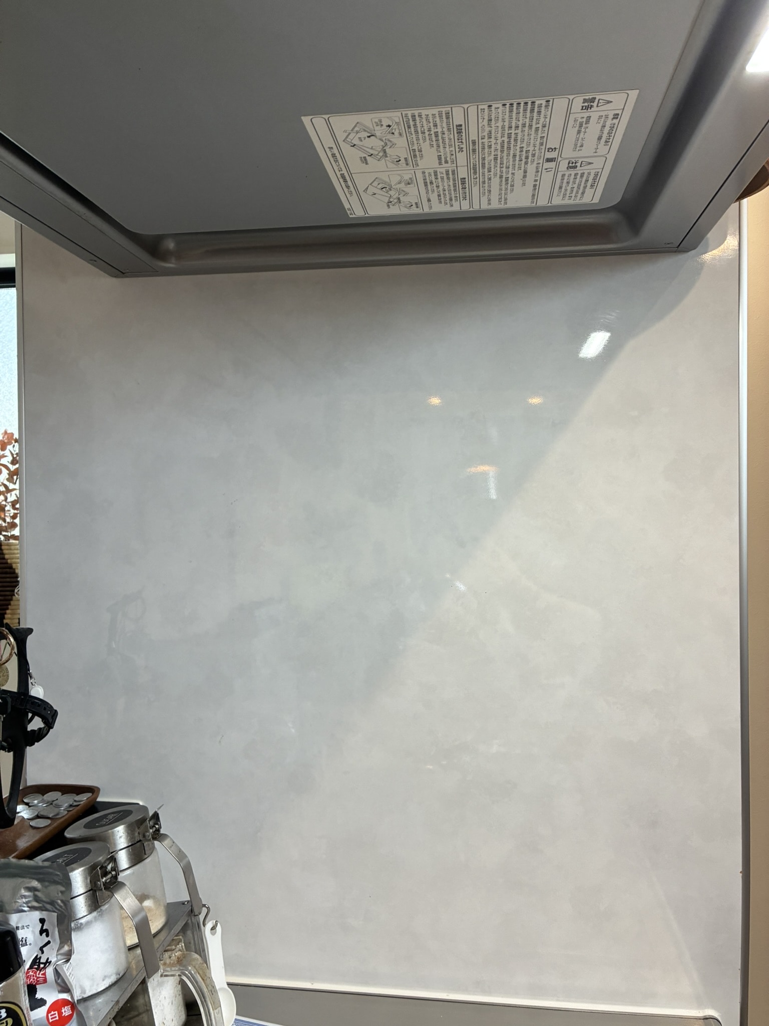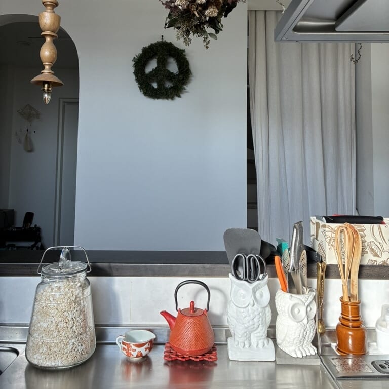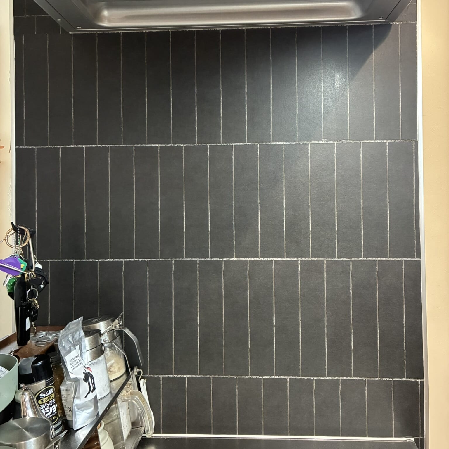今回はキッチン横の壁をDIY。元は超スタンダードな白ベースにグレーがかった色味でしたが、