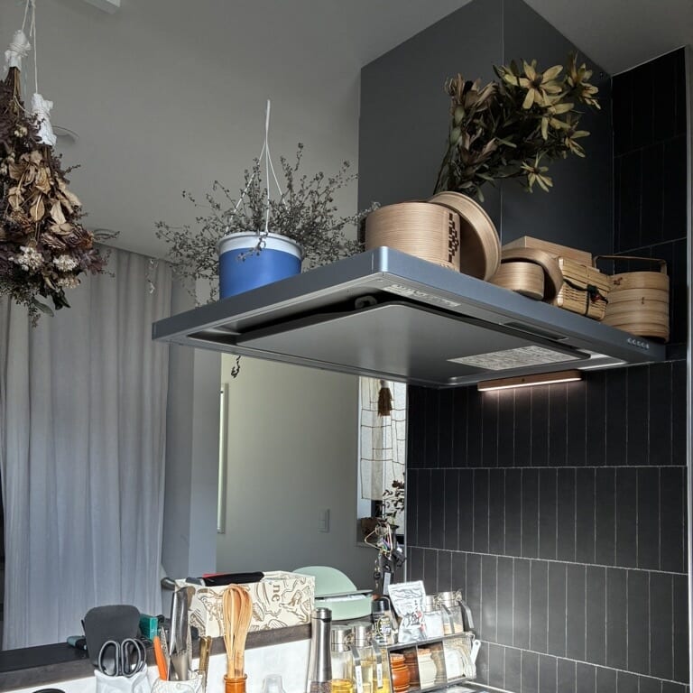 空間全体は好みの印象になったけれど、想像していた以上に暗かったため、マグネットで簡単に取り付けられるライトをプラスしました。LEDで充電式。雰囲気もよりアップして結果オーライ!