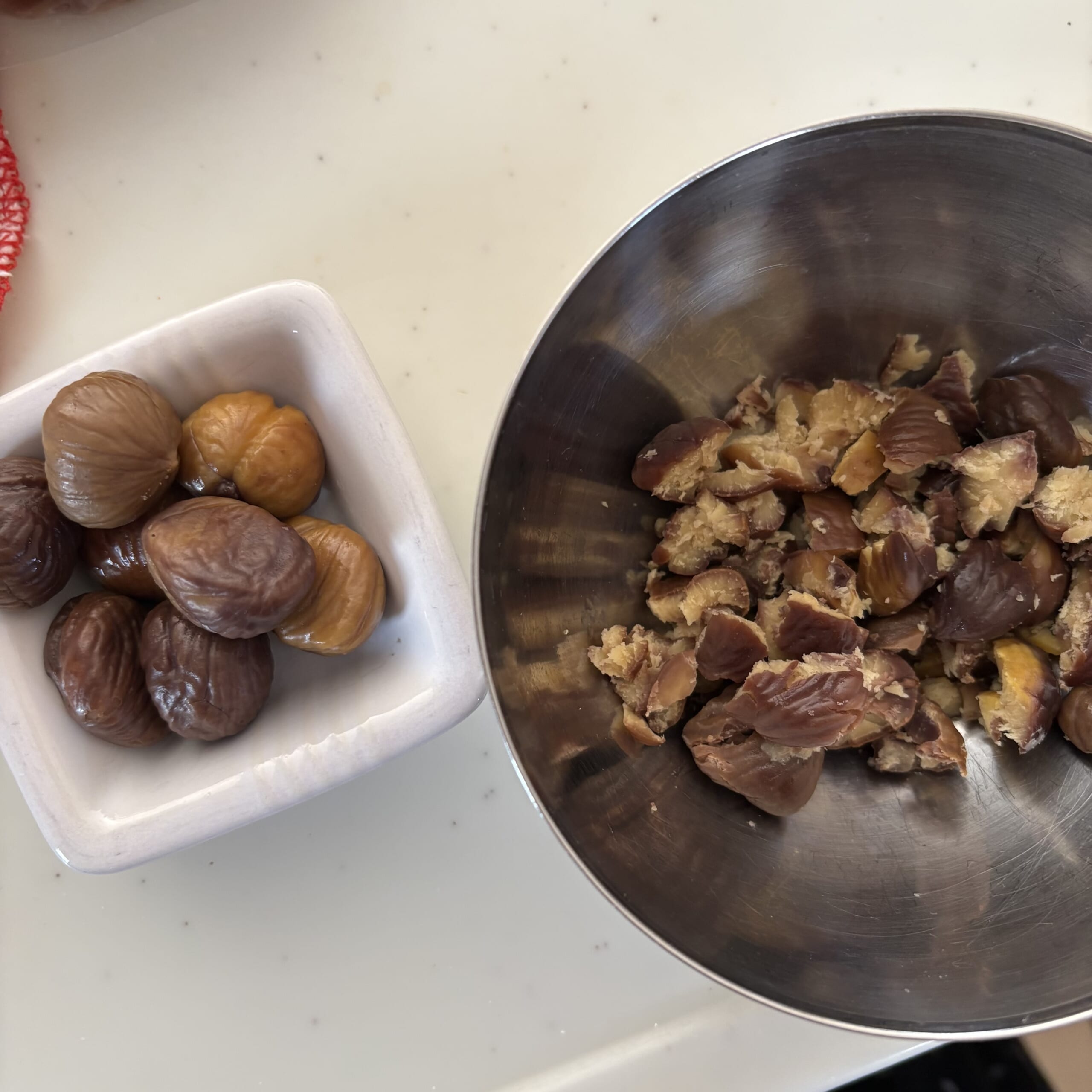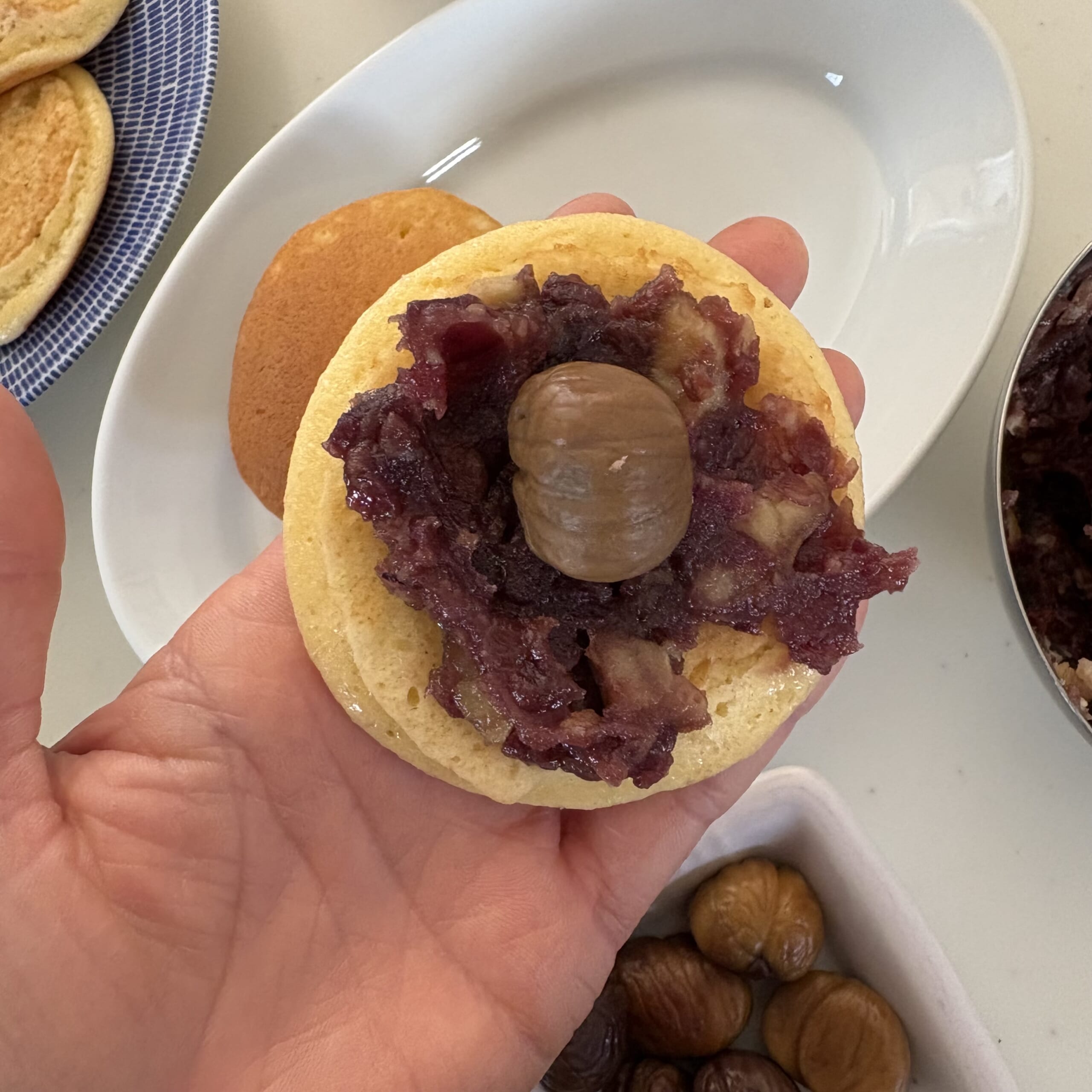今回は苺ではなく、「栗どら焼き」に。これもお手軽にスーパーで売ってるむき栗を購入して、軽く潰したものをあんこに混ぜ、中に1つ挟んで出来上がり✨