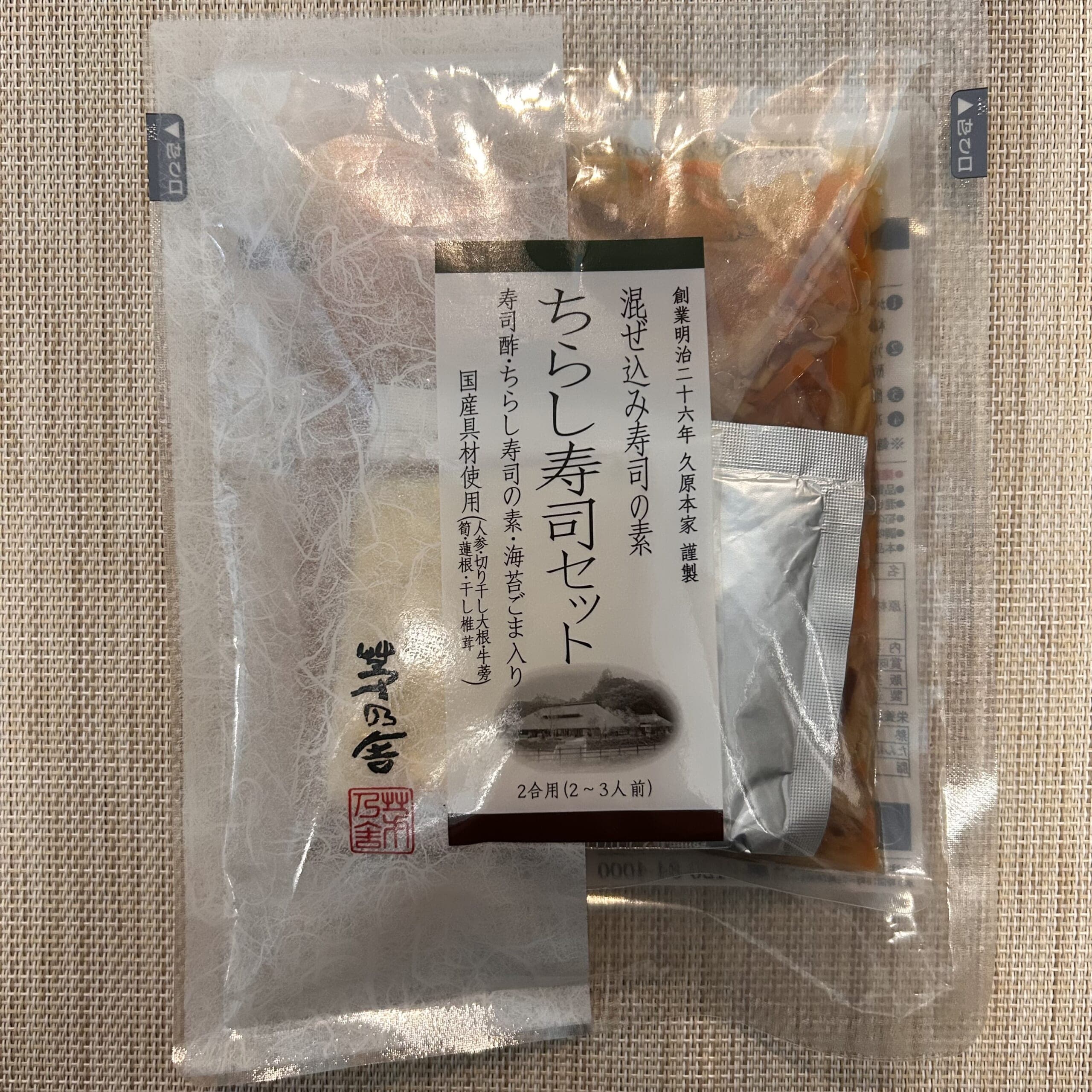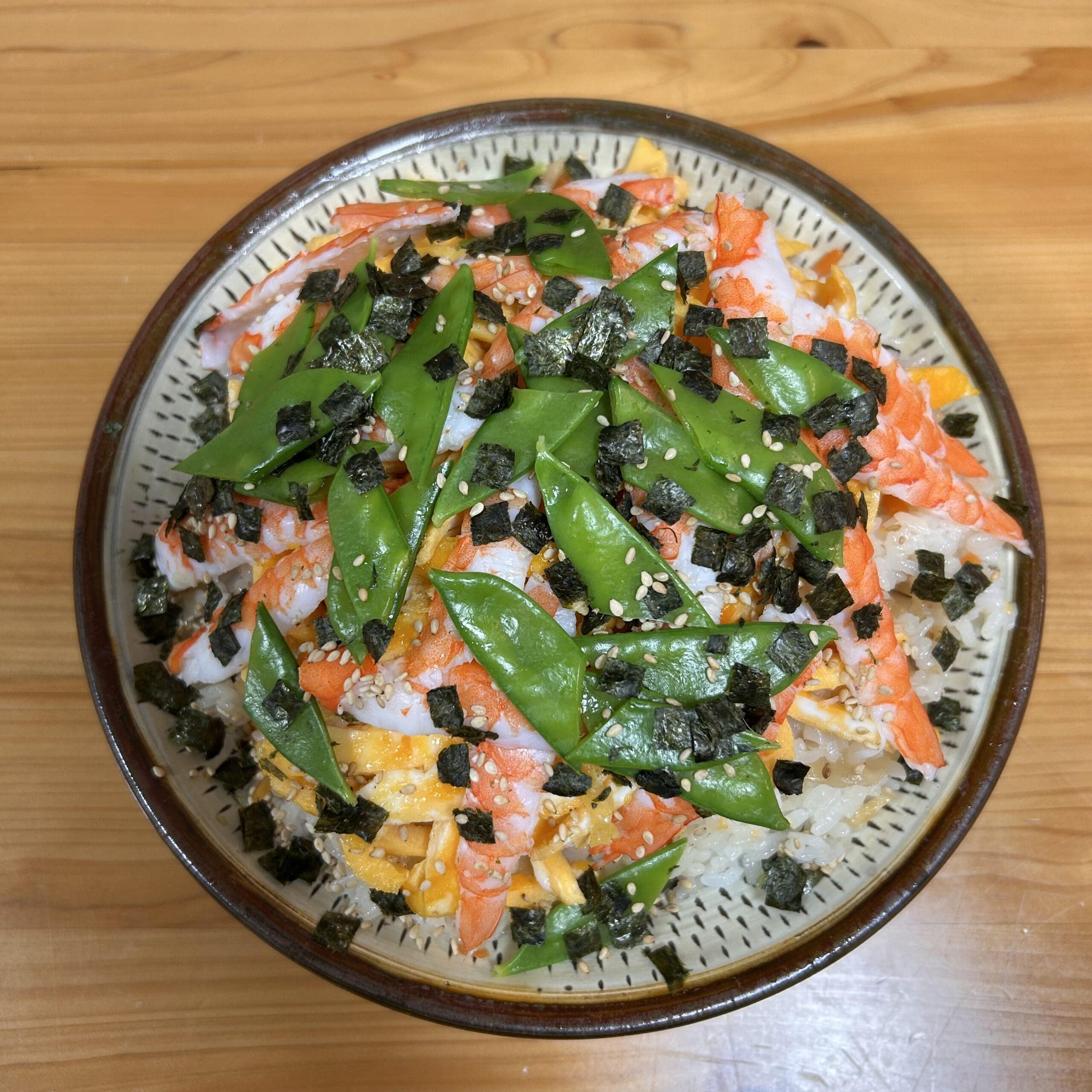 このモリモリちらし寿司は茅乃舎のちらし寿司の素をベースに、錦糸卵とボイルした海老、きぬさやを乗っけただけです♩