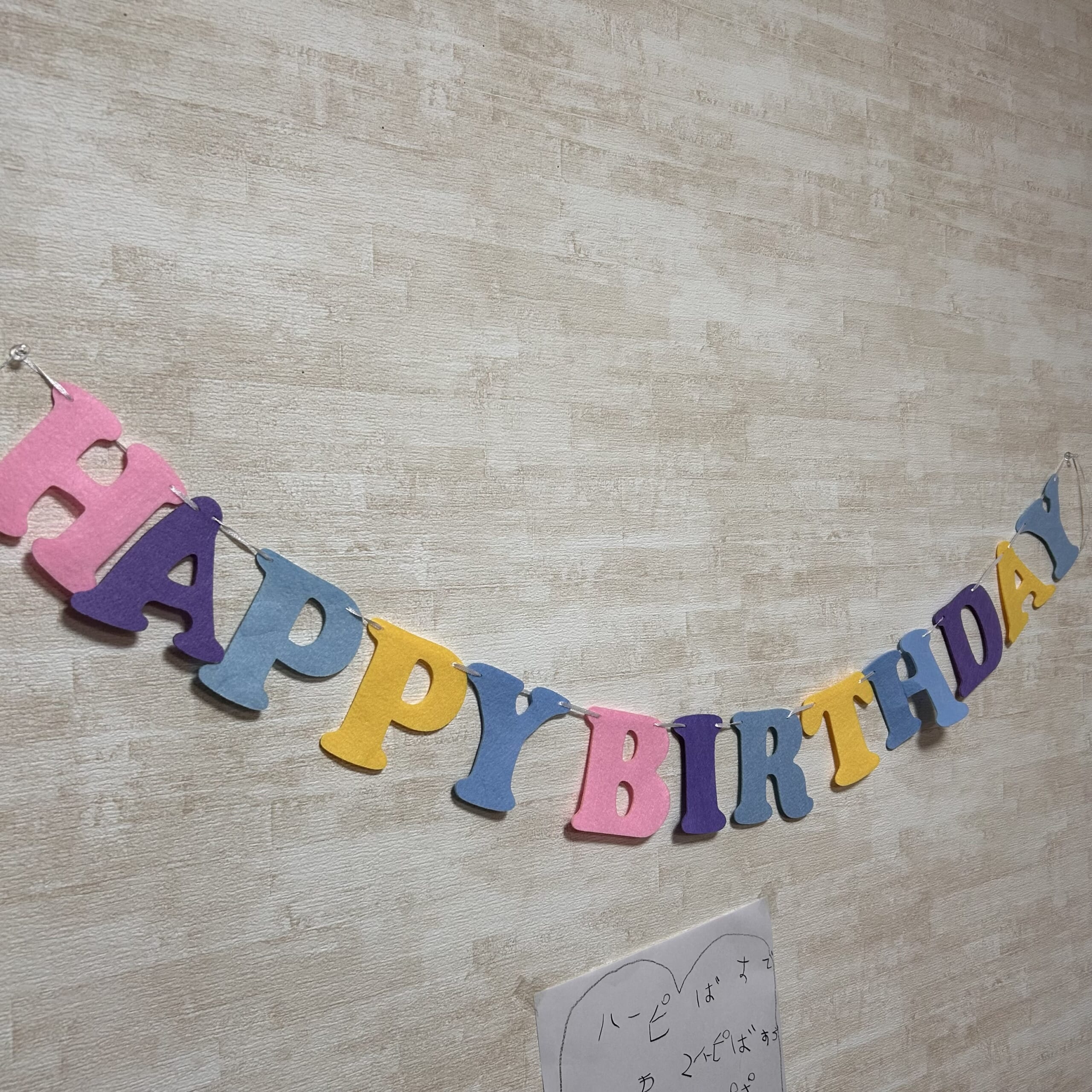 パパが帰ってくる前に!と必死でガーラントを取り付ける私、下の紙は、こだみがハッピーバースデーの歌詞を書いて貼っております。ハーピばす…ってのっけから何か違うけどまあよし🙆