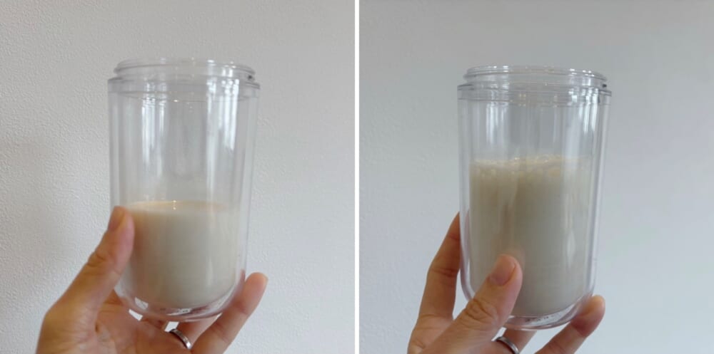 深めのコップに牛乳や豆乳を入れて、サイドのスイッチを入れます。