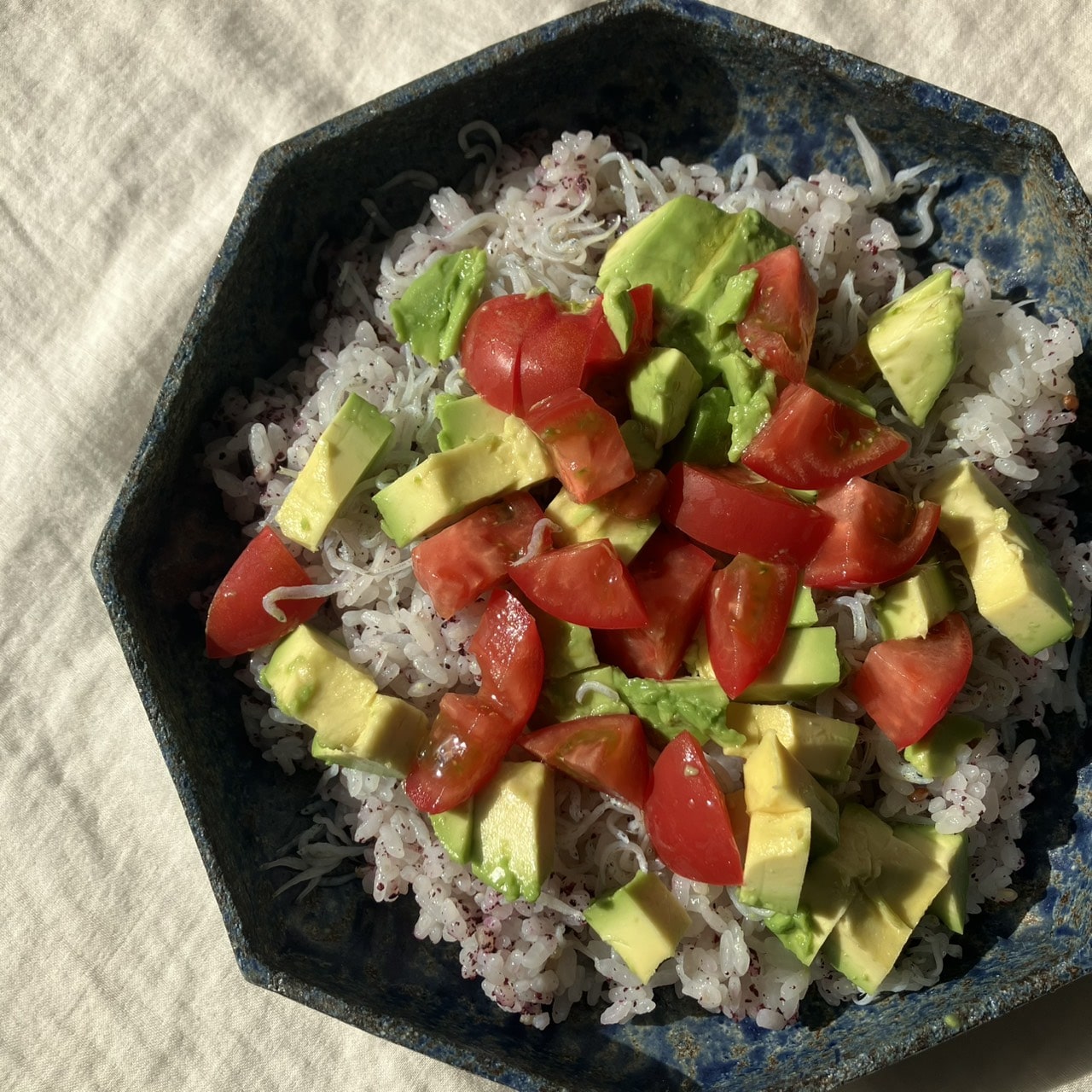 寿司めしに赤じそふりかけを混ぜ、バランスよく食材を並べてごま油を回しかけたら出来上がりです。