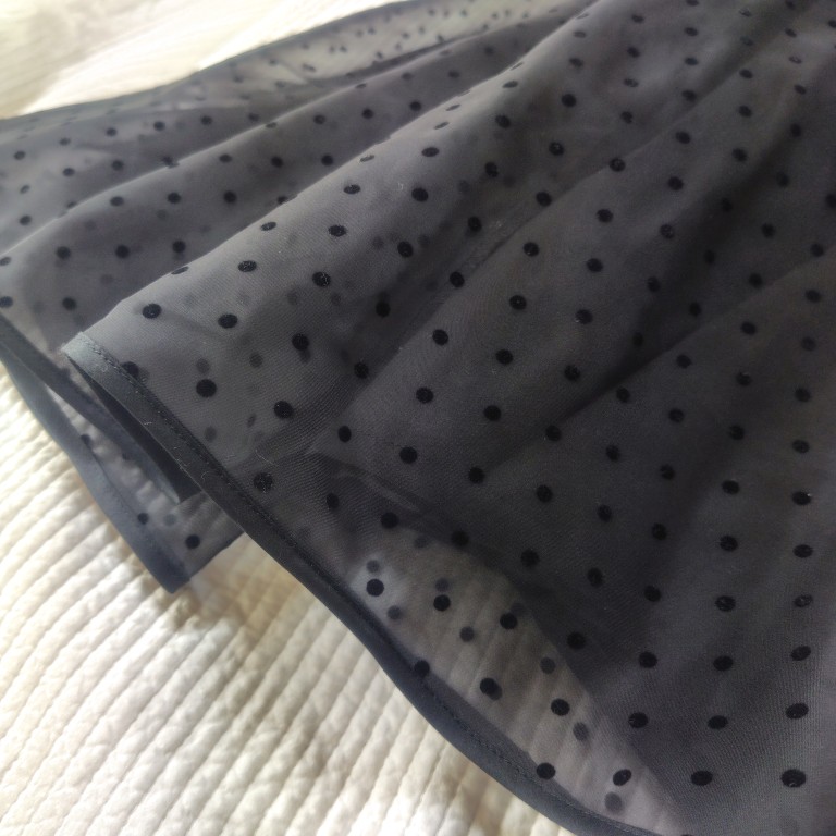 大人服にしても品よくまとまるスベスベのオーガンジー生地に、フロッキープリントのドット柄が水玉模様好きには見逃せない1枚です。