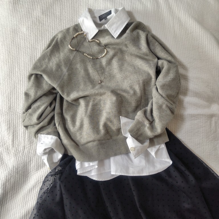 チュールスカートは、永遠に好きなんですよね。オーガンジーのこのスカートも、ワントーンでまとめると甘すぎず良さそうかも!