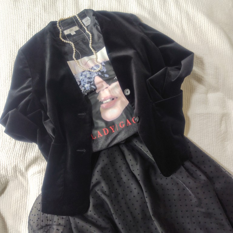 ZARAキッズのレディー・ガガのプリントTシャツを主役に、ジャケットをベルベットの羽織って。これにコンバース可愛いかも♪