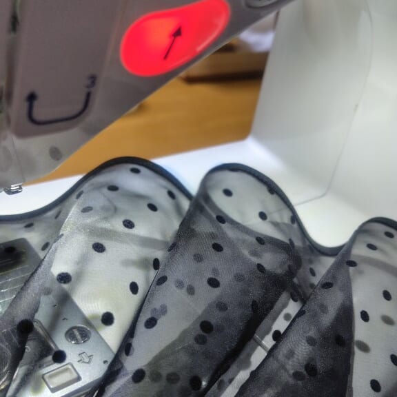 内側のローン生地で、約4メートルのバイアステープを作りオーガンジーの縁をぐるっと包みました。