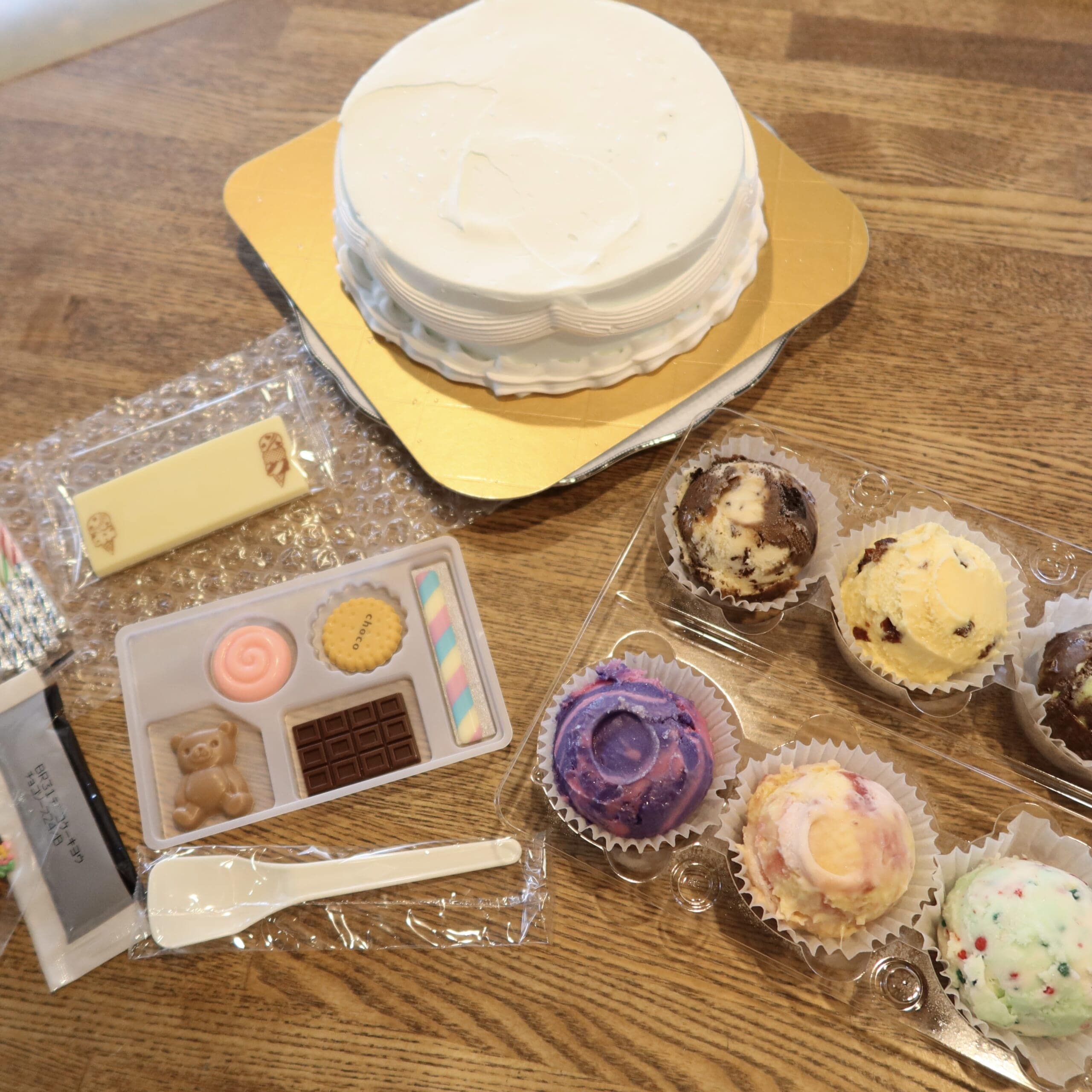 土台となるケーキ(2種類から選べます)と好きなフレーバーのアイス6個を選んで、仕上げのデコレーションは自分たちでできるというケーキです。
