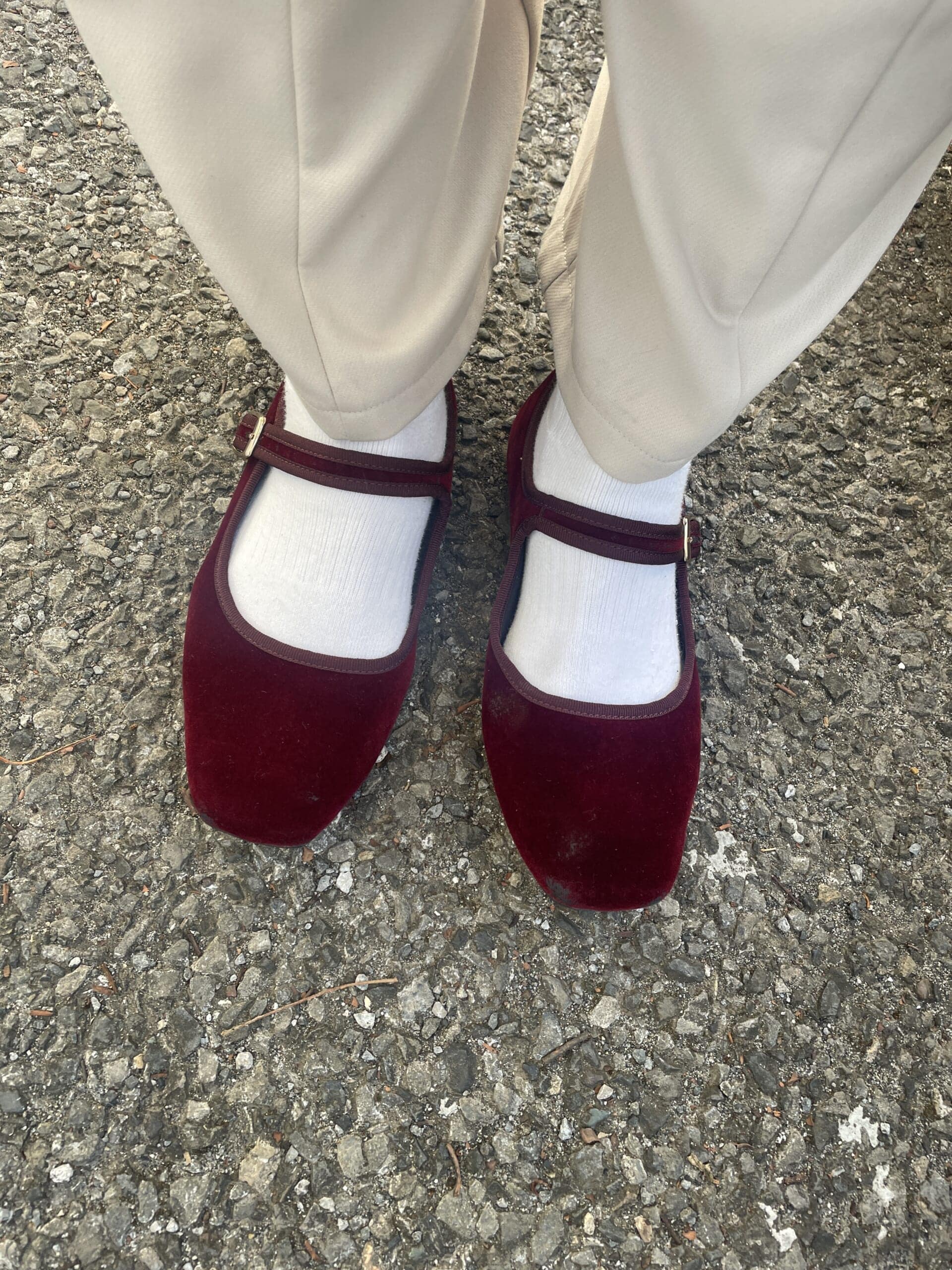 シャツはユニクロ、白パンツとベロアのシューズはGUです。いつもの服だけど、紺ブレとスカーフのおかげで、きれいめにまとまったかな?!