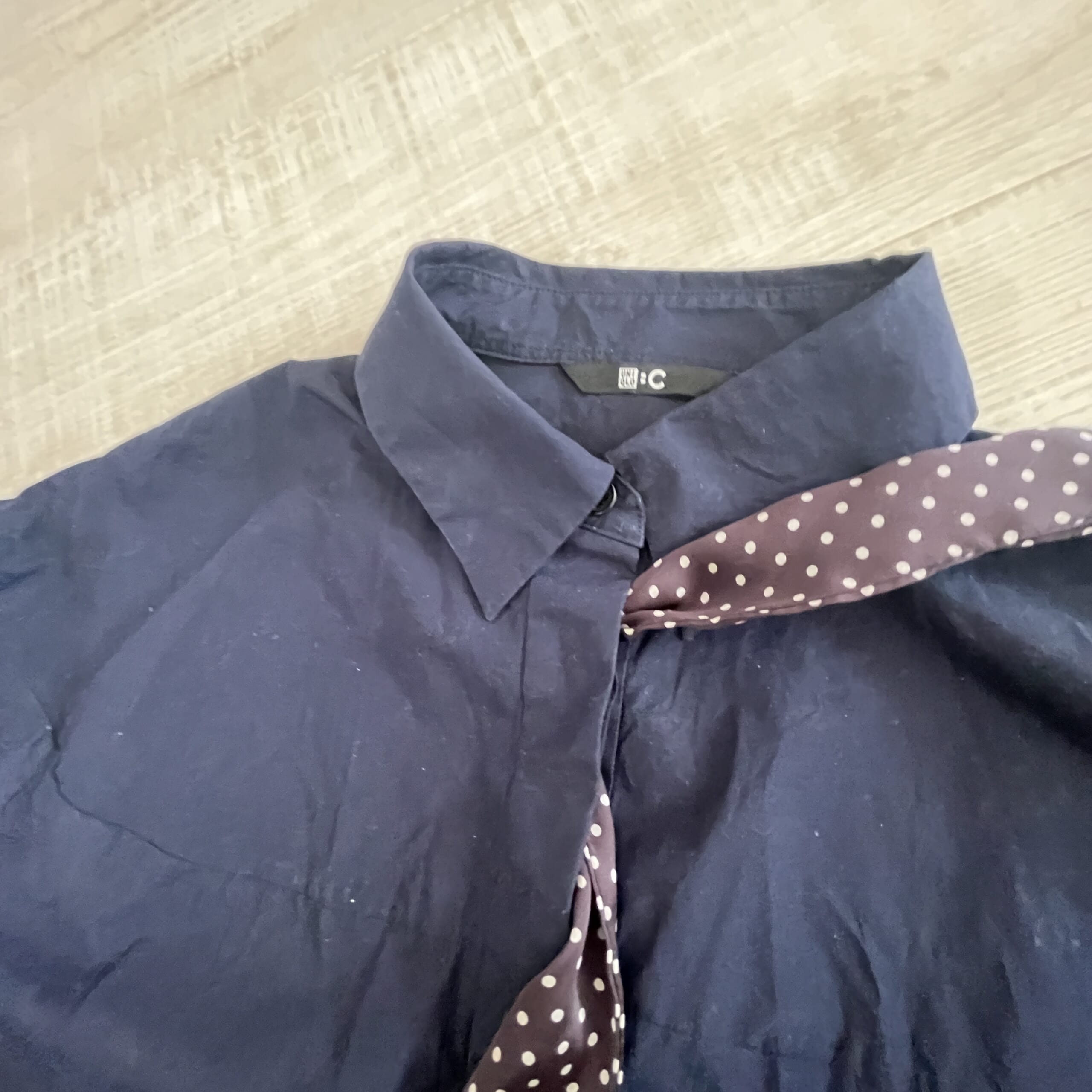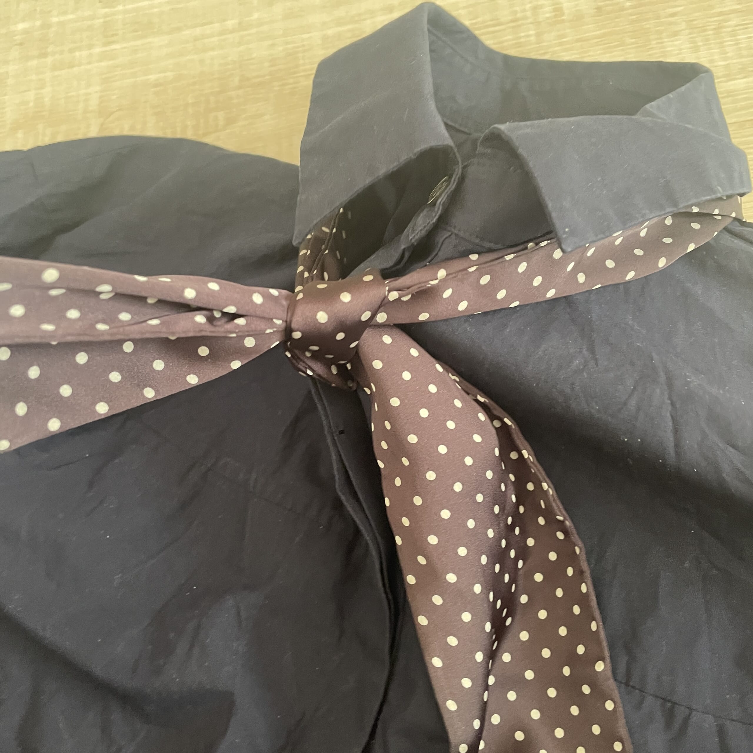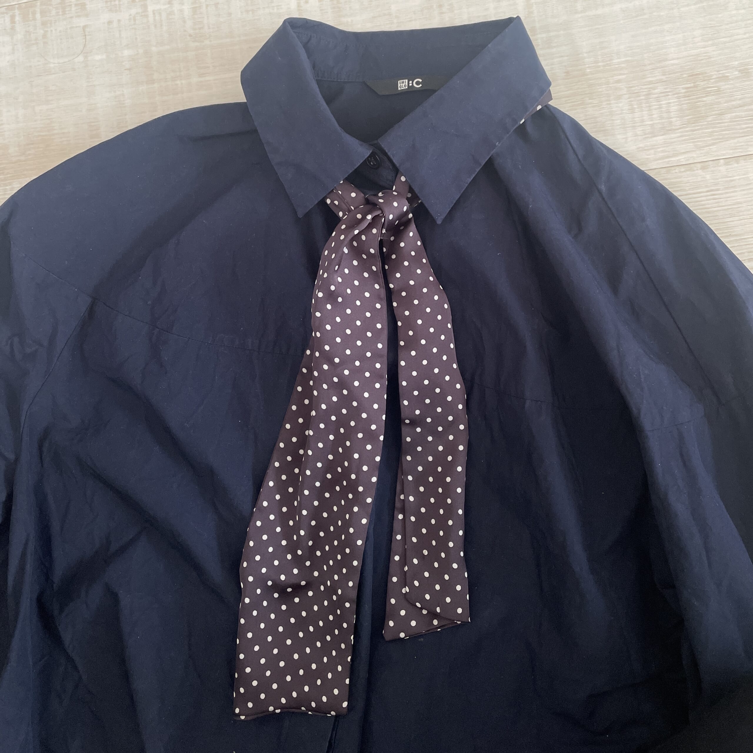 ユニクロシャツをドットのネイビースカーフ使ってボウタイブラウス風に