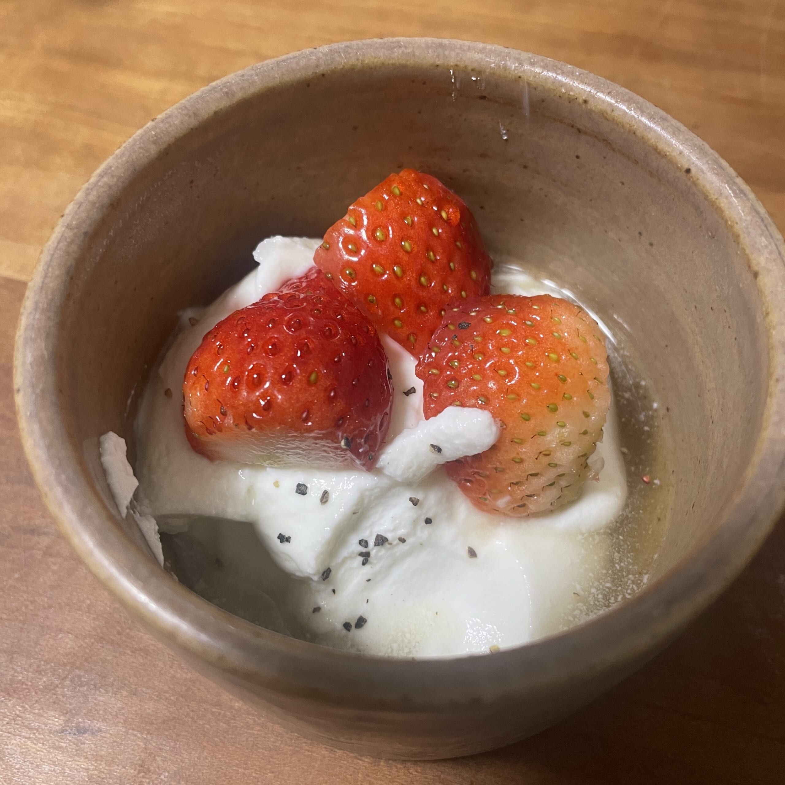 いちごを煮立たせるのをわすれてしまったのですが、みりんがシロップになるなんて斬新!黒コショウで、一気に大人のデザートに。