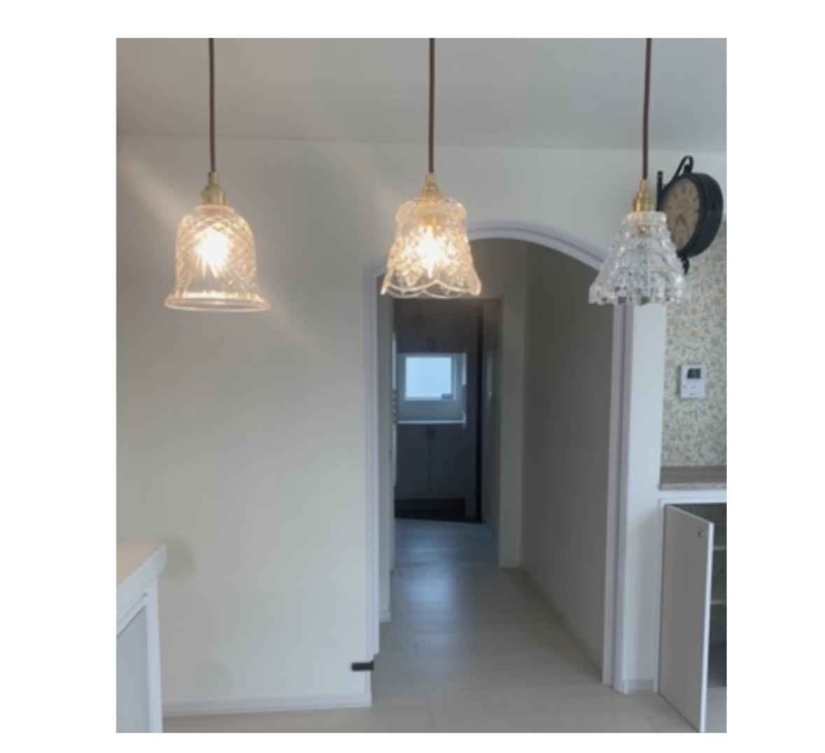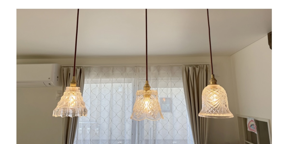 一番のお気に入りのこちらのライトを真ん中に吊るしてみました。アンティーク調のガラスの作りもとても気に入っています。天井に映る光の模様がとても綺麗で、照明の大きさも雰囲気も、我が家の天井のアイボリーの色とマッチしていて、購入して良かったです。