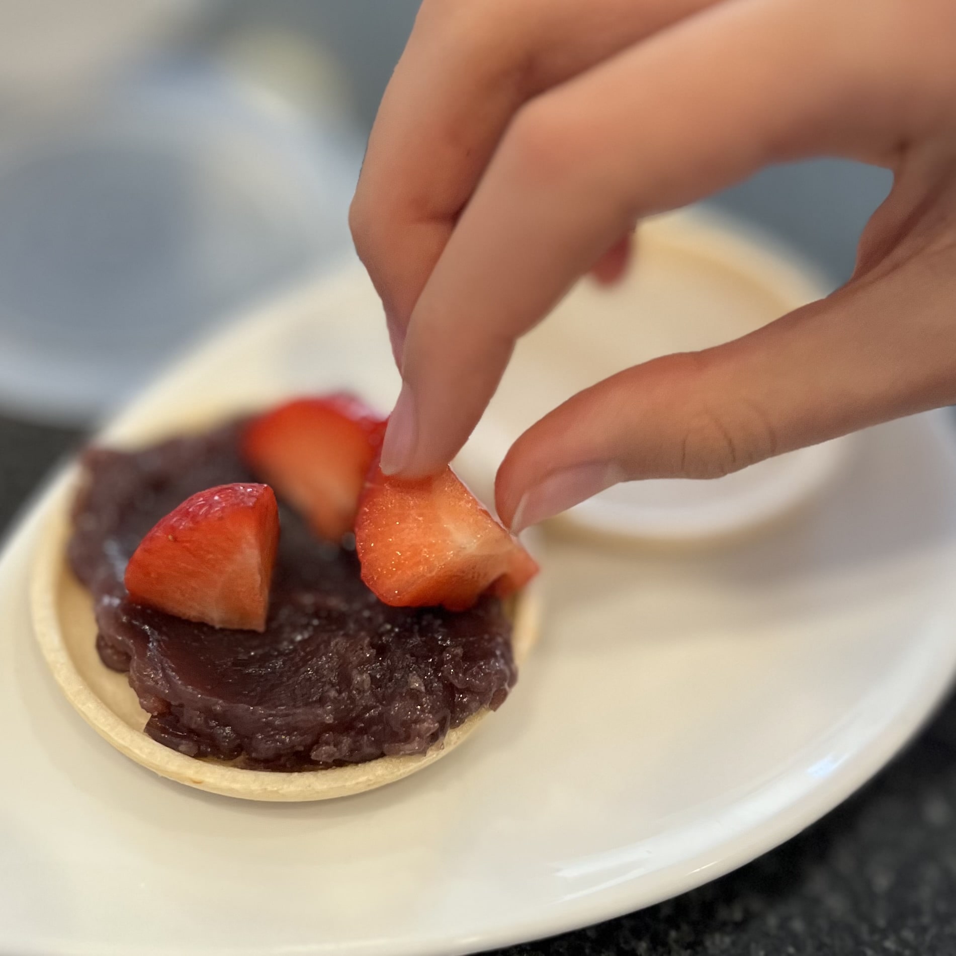 ムスメのお気に入りは、カットしたいちごを小倉あんと一緒に最中に挟むこと。
