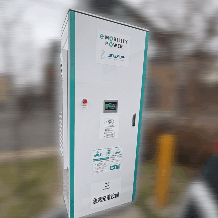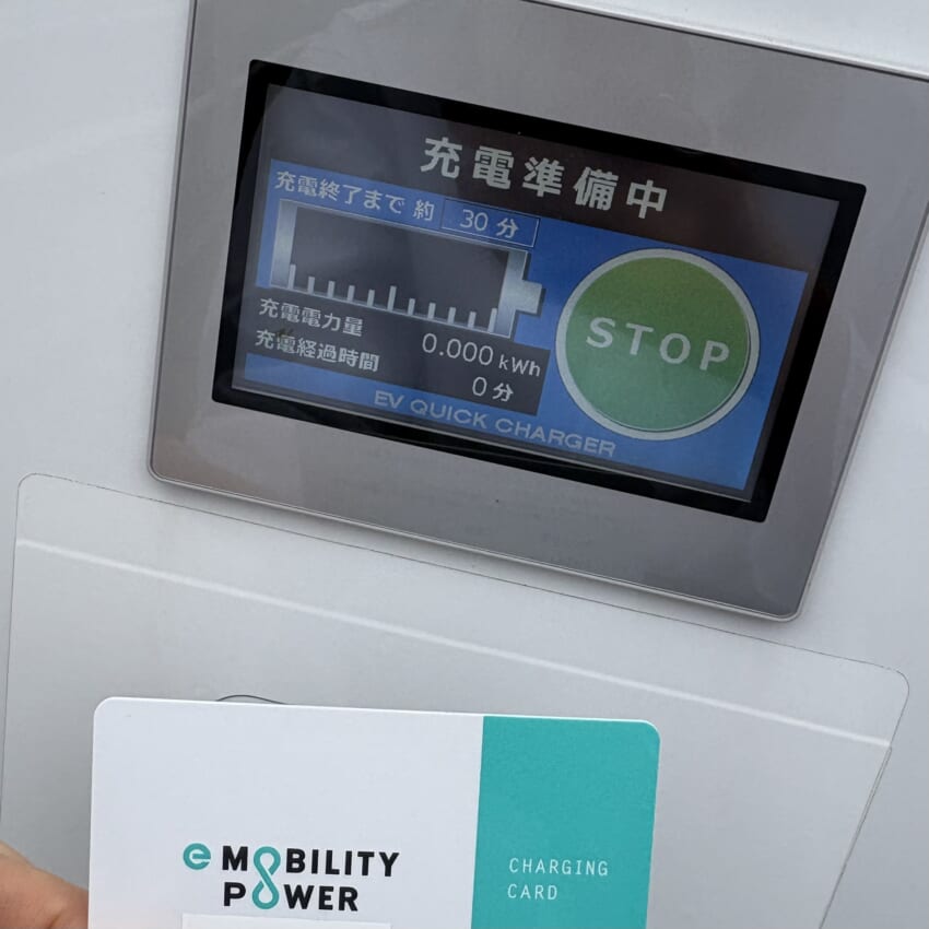 カードを機械にタッチして、車のフロント部分に2つ備わっている充電口の「急速」側に、充電コネクタを差し込むと、カチッと音がして充電が行われ始めました!