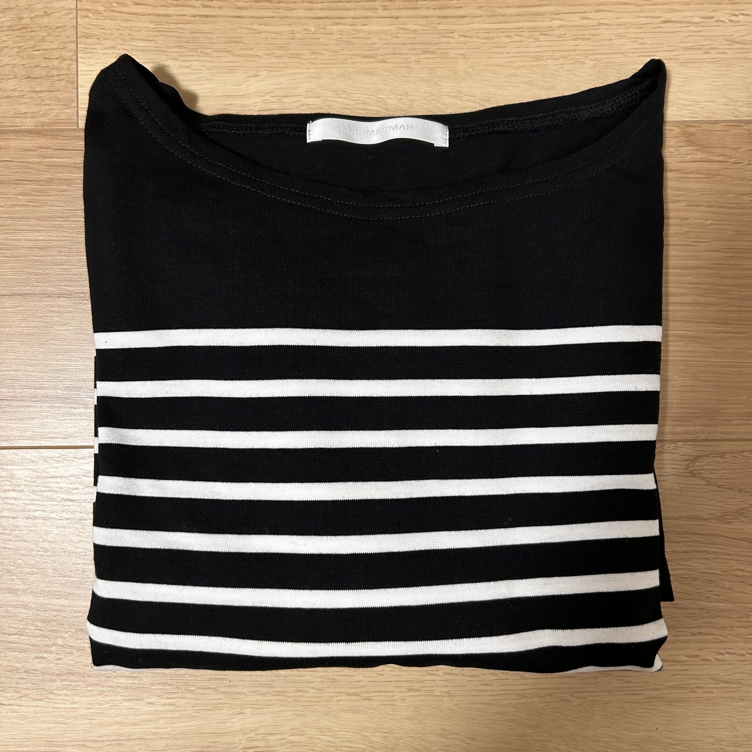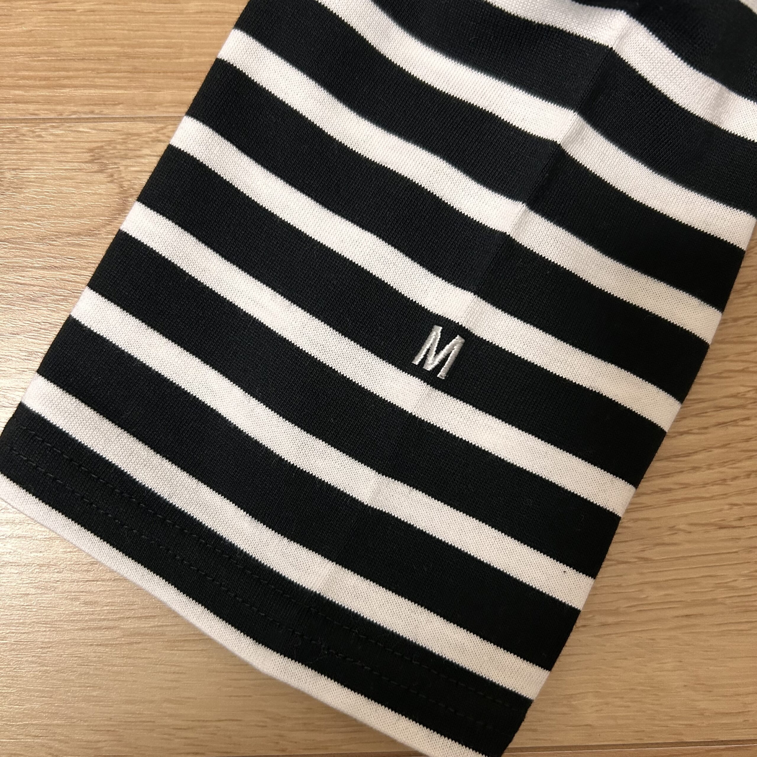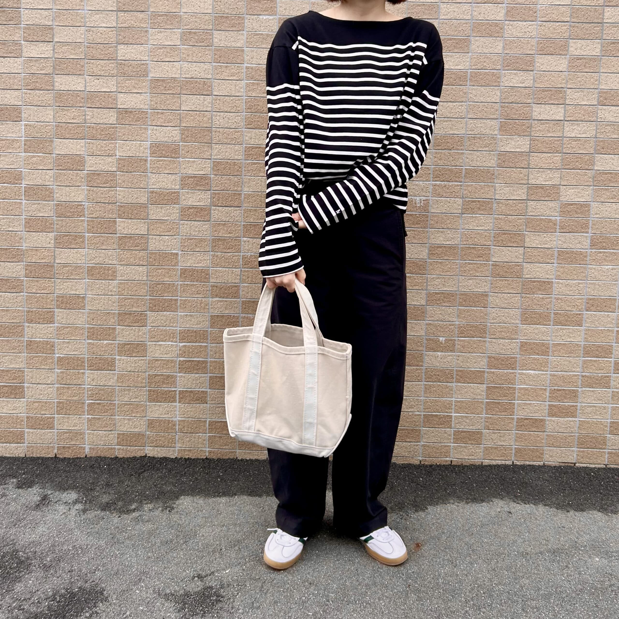 黒ボーダーのバスクシャツ。定番アイテムかと思いますが、こちらはフリーサイズでも結構メンズライクなシルエット。