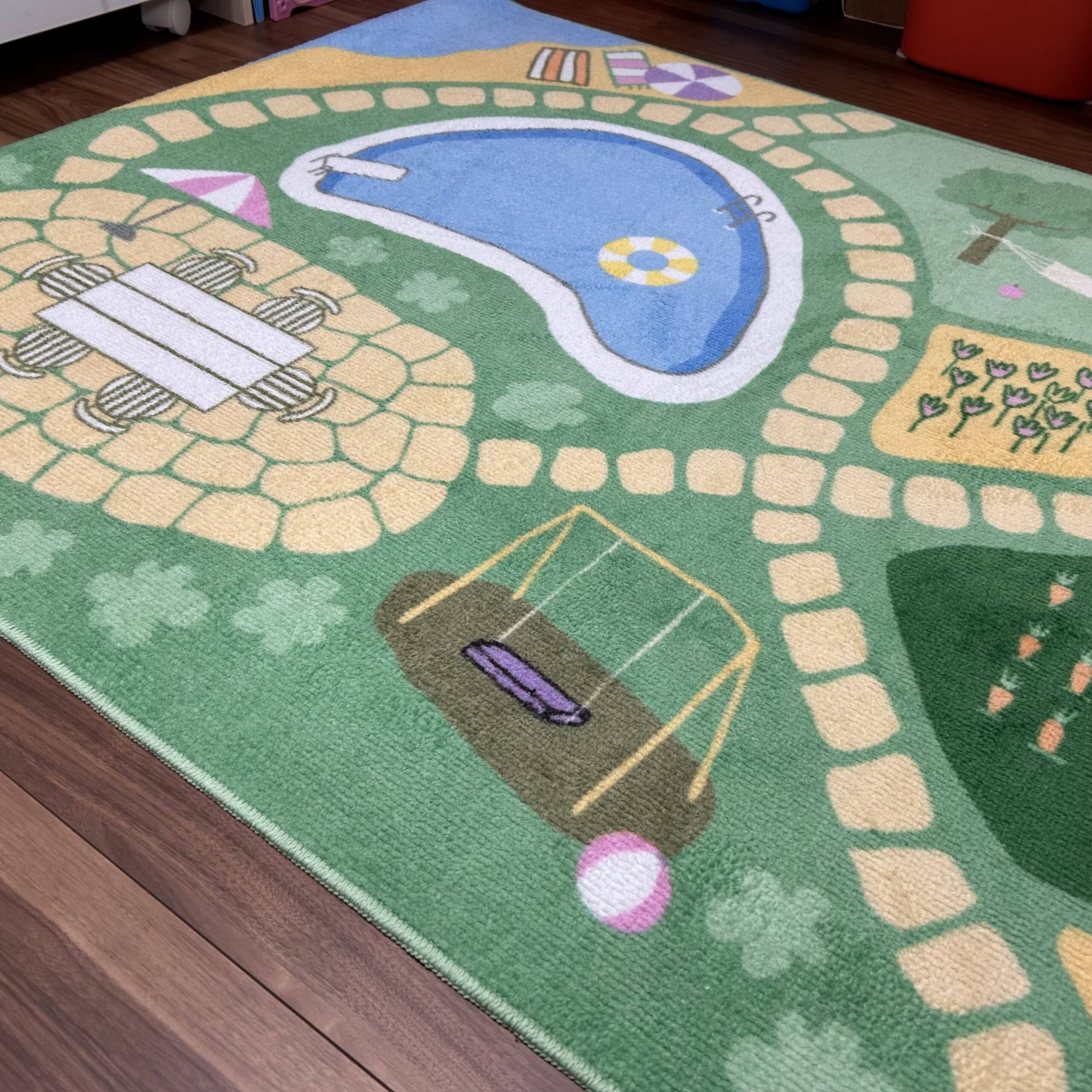 100×133センチ。プールやブランコがあって、子供の想像力が働きそうな、かつ可愛いカーペットですね。こちら、こだみセレクト。他にも、キリンさん柄や、ハート柄(母はこちらに食いつくと思っていた)もありましたが、一目惚れでこちら。価格も2,999円。安い〜。