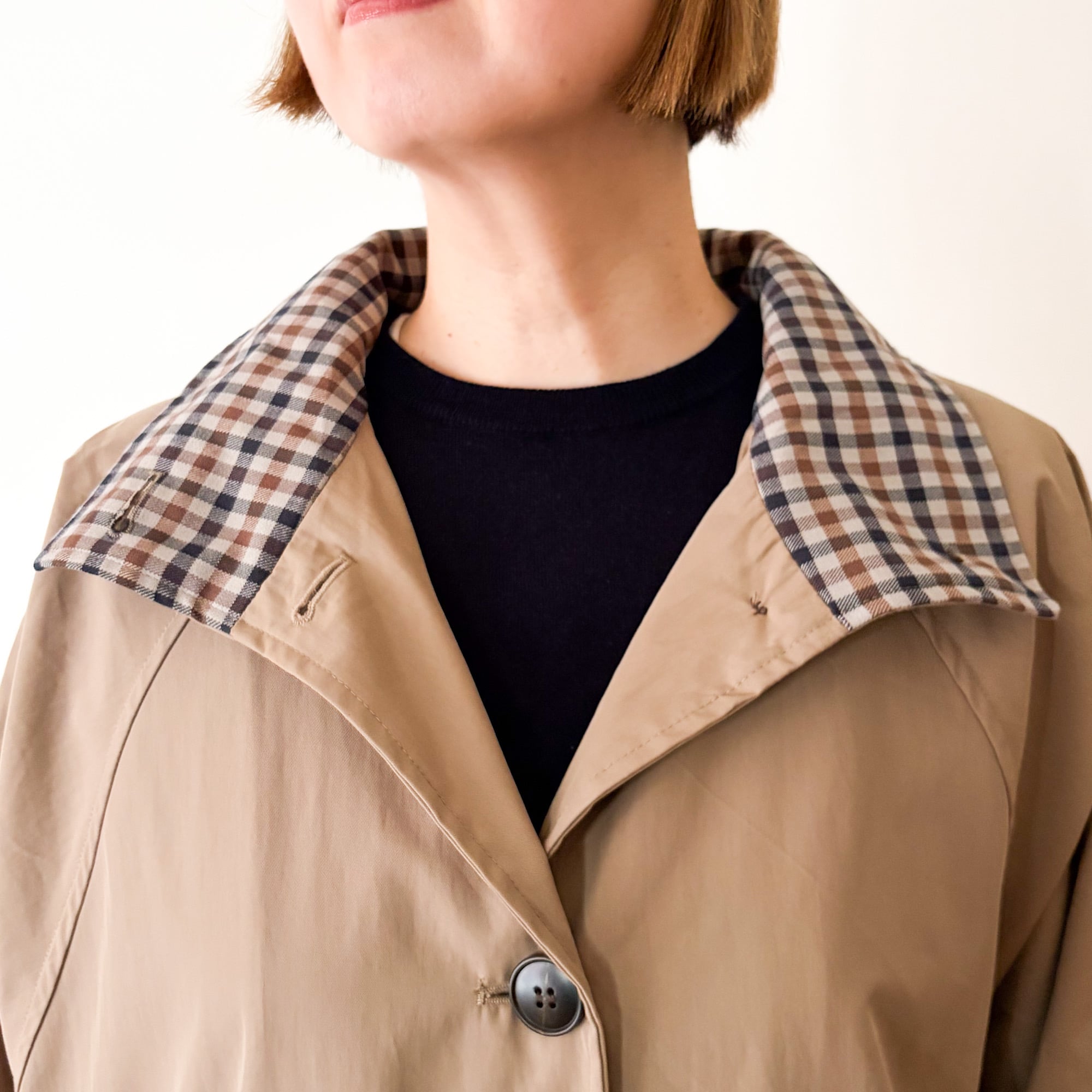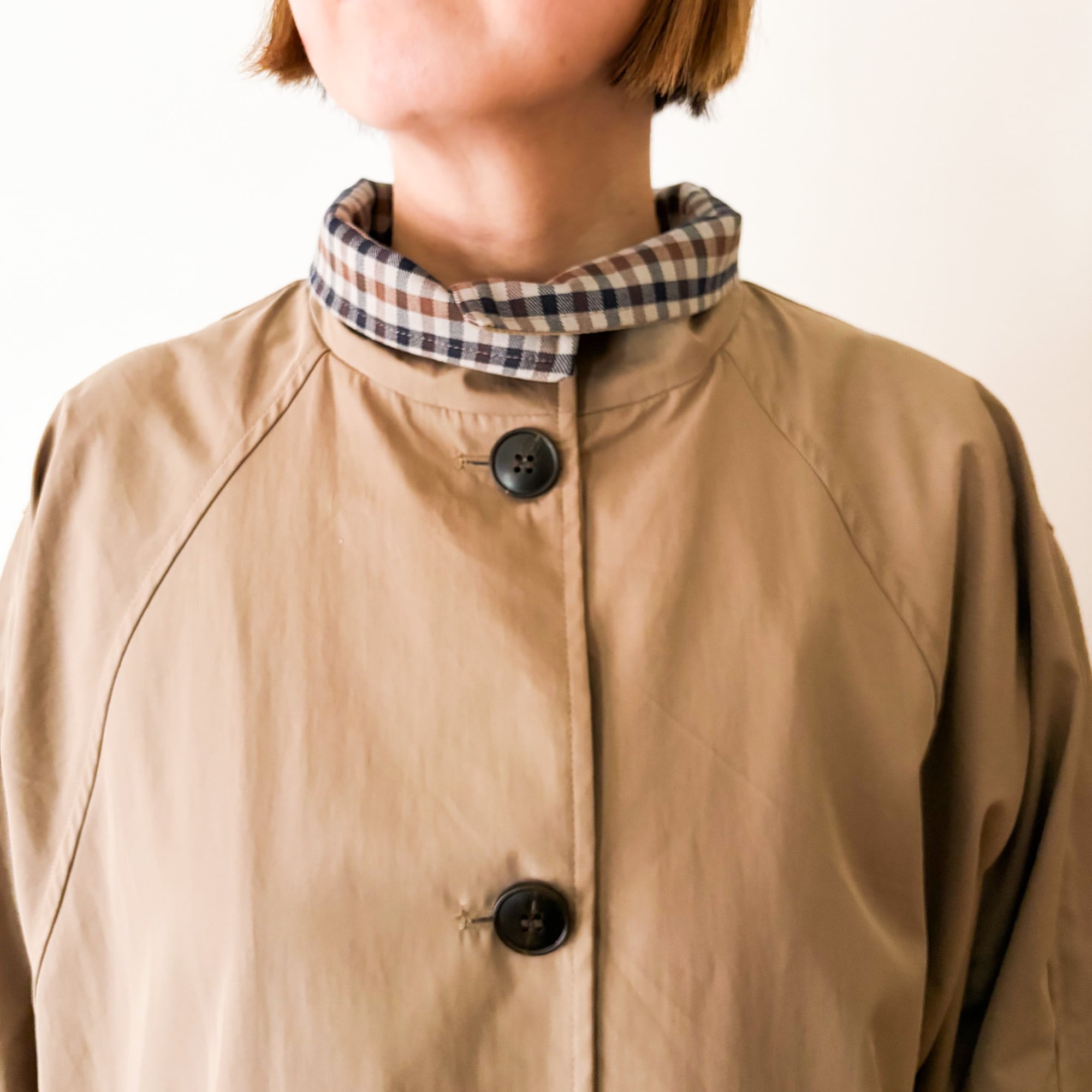 上までボタンを留めてくるっと襟を曲げて、チェック柄をアクセントで出したり。