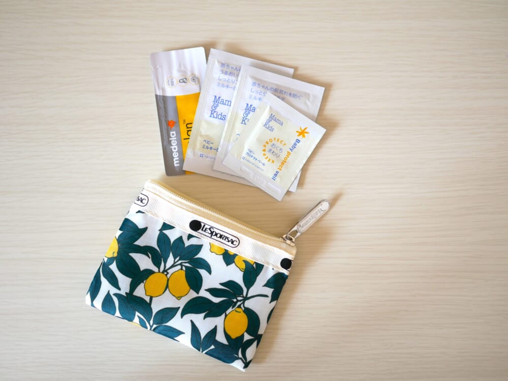小サイズはサンプル入れに。最近は産後ケア施設に行くことが多いので、子どものケアセットを入れています。