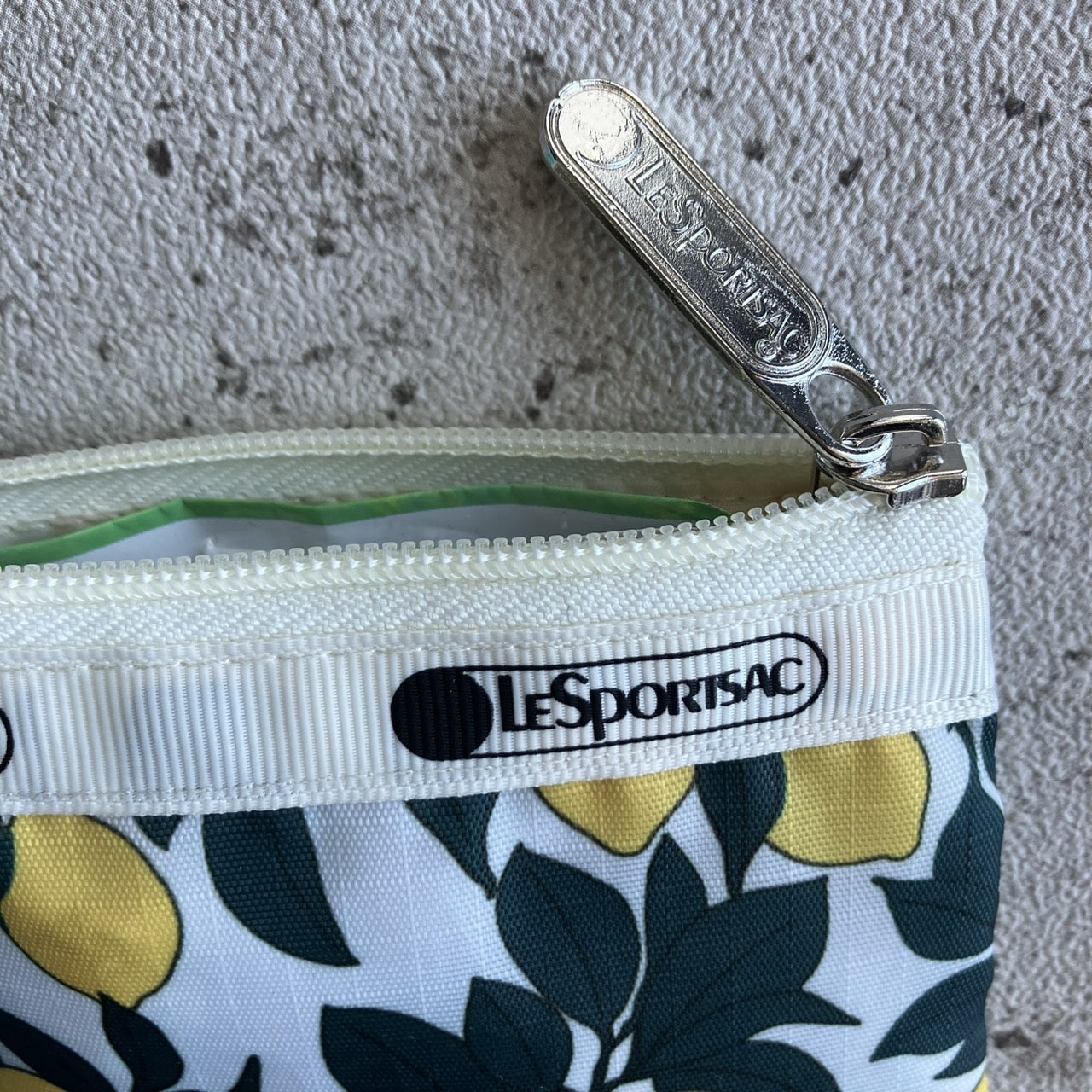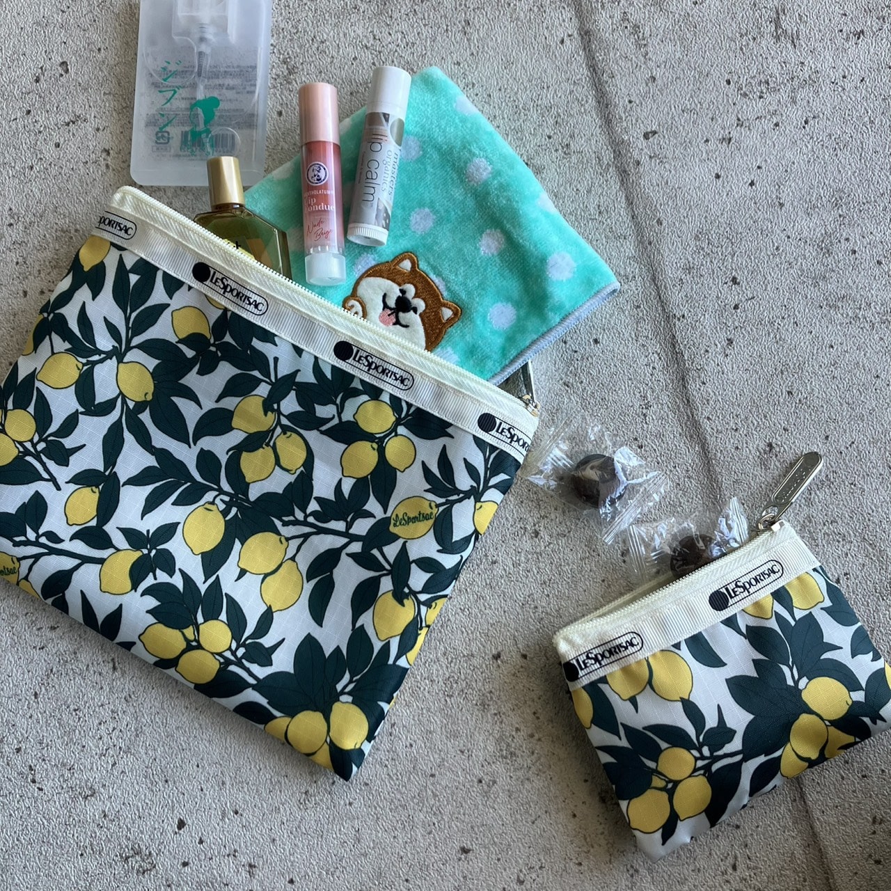 パッと目を惹くイエローとグリーンのレモン柄ポーチ。ミニサイズとセットでとっても豪華です。