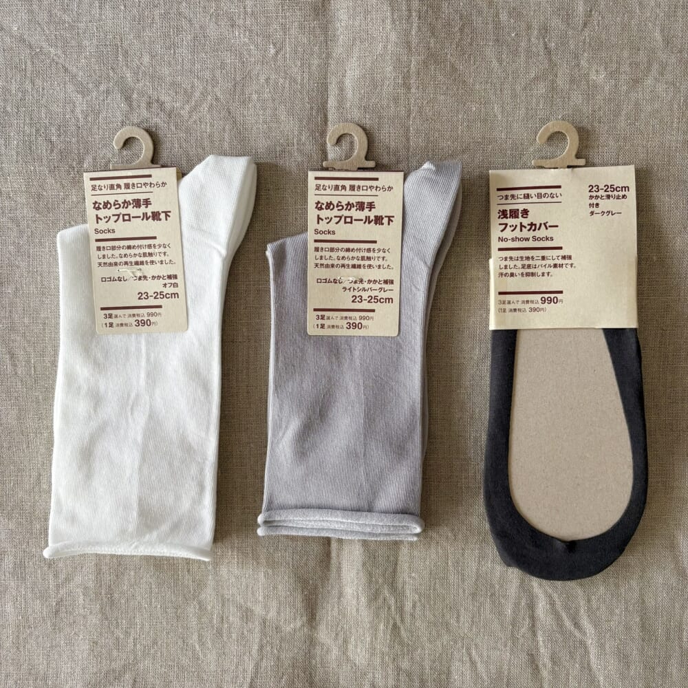 もう少し温かくなったら薄手の靴下を合わせて履きたいな、と思い、同じく「無印良品」で「なめらか薄手 トップロール靴下(オフ白/ライトシルバーグレー)と「浅履きフットカバー(ダークグレー)」も購入しました。