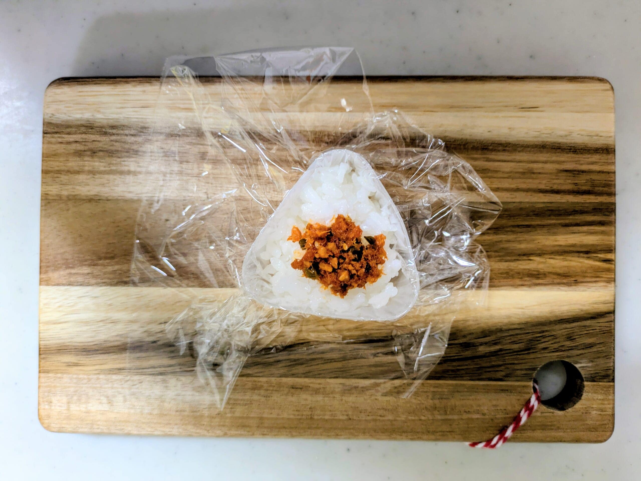三角おにぎりの型にラップを敷き、ごはんと具材を入れればおにぎりの完成です