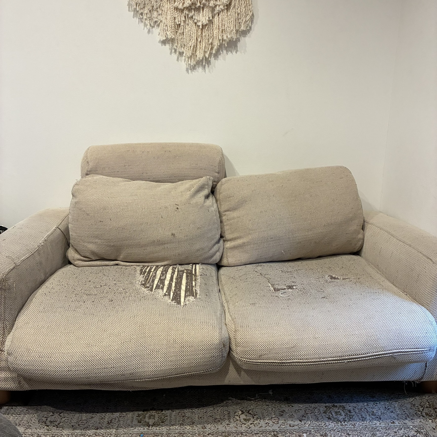 座面がボロボロ&黒ずんでいて痛々しい姿ですが、「今までありがとう!」の意味を込めて?!載せておきます。12年間頑張ってくれたソファは「無印良品」で購入したもの。2人でゆったり座れる2,5シーター。座面が広くて背もたれのクッションを取ると寝られる!という点が気に入って購入。形もベージュの色味も気に入って、過去2回の引っ越しにも同行してもらった思い出の品。去年、座面のシートが本格的にさけはじめ、カバーの買い替えようとしたところ、すでに廃盤(涙)もうソファ自体を新調しどきなのかも知れない。それまでは大きな布を掛けて目隠しをしていました。