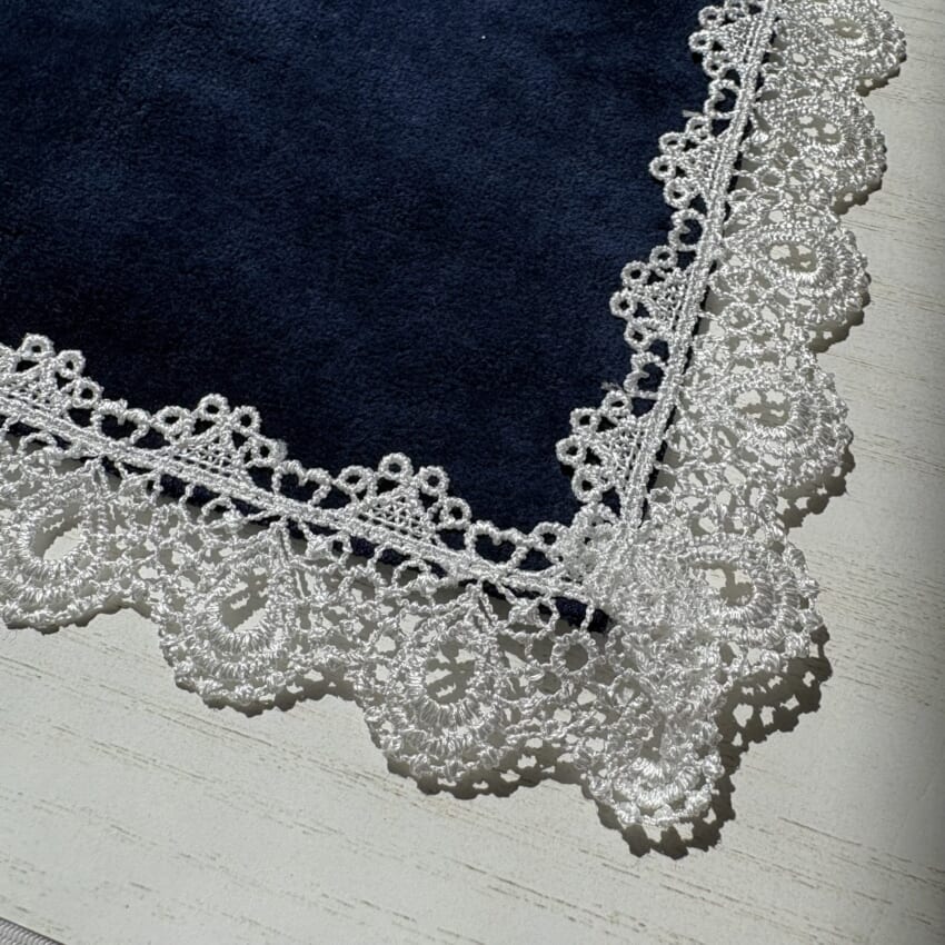 パキッとはっきりした色味のネイビーが、白いレースの繊細さを際立たせます。