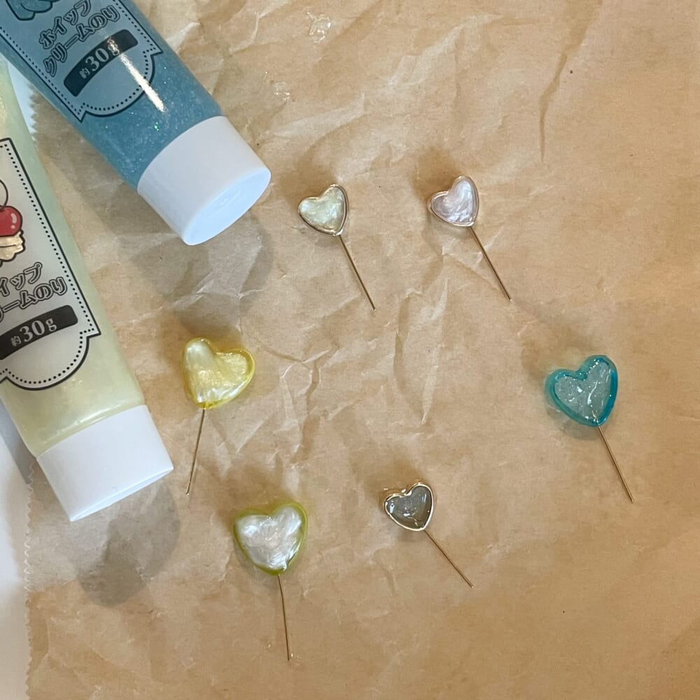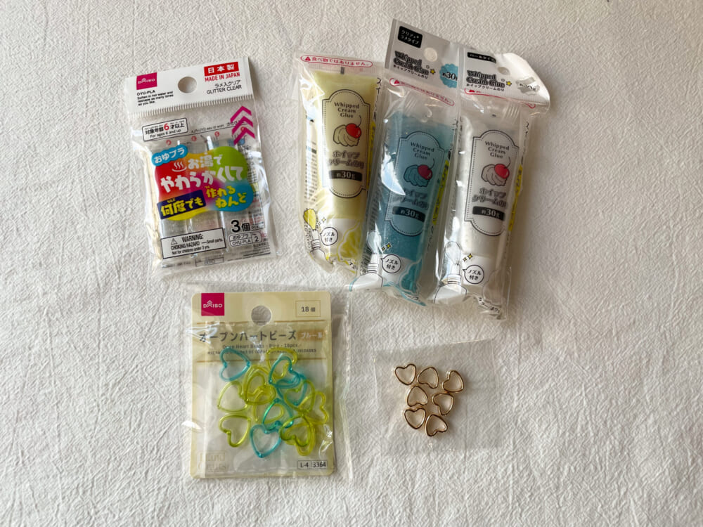 こちらお湯ねんど、ビーズはダイソーで。ホイップクリームのりはセリアで購入しました。