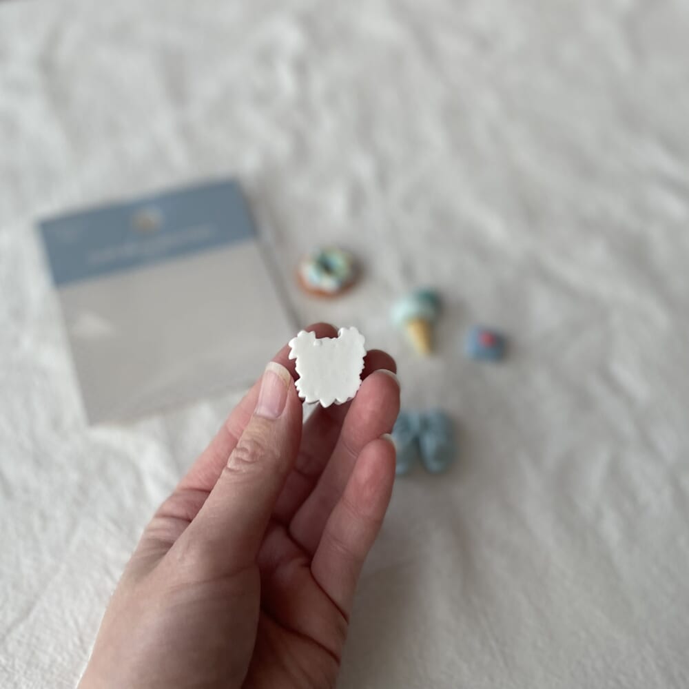乾いてからうめた部分にシールを貼り、Qピンにデコビーズ類を通して完成!