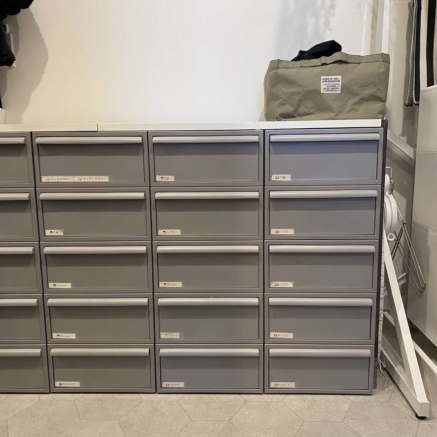 グレーの棚には子どもの下着&季節の服、大人の下着類とタオルなどを収納。細かくラベリングをして、誰でも片付けられるよう工夫しています。(いつの日か自分で片付けて〜!の願いを込めて!)