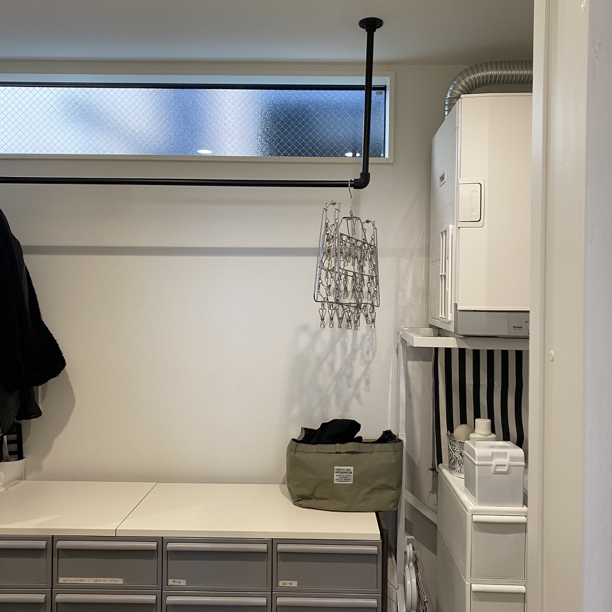 基本は乾燥機で乾かしていますが、乾燥機NGの服やアウターなどを掛けられるよう、アイアンバーを設置。アイロンがけもここで完結できるように棚上にコンセントを付けました。