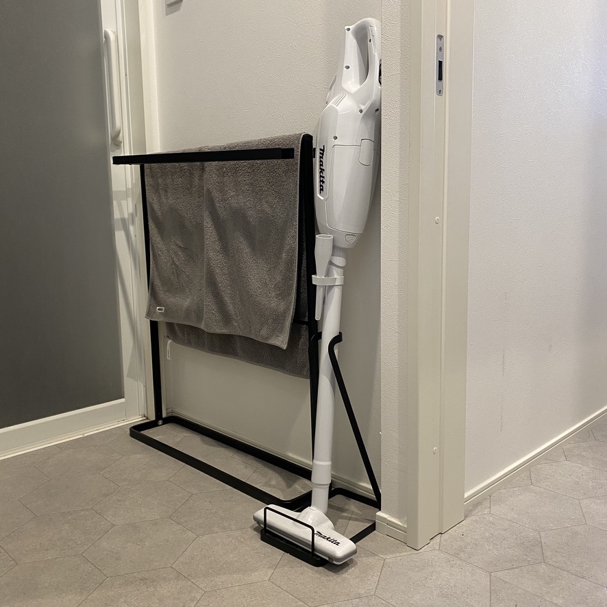 タオルラックと掃除機ラックは共にTOWERシリーズで統一。困った時のTOWER頼み!こんなにシンプルで省スペースなのに最大4枚掛けられるので我が家にピッタリ。家族全員が毎日必ず使う場所なので、極力ミニマムに。シンプルに。を合言葉に洗面&脱衣所は組み立てました!