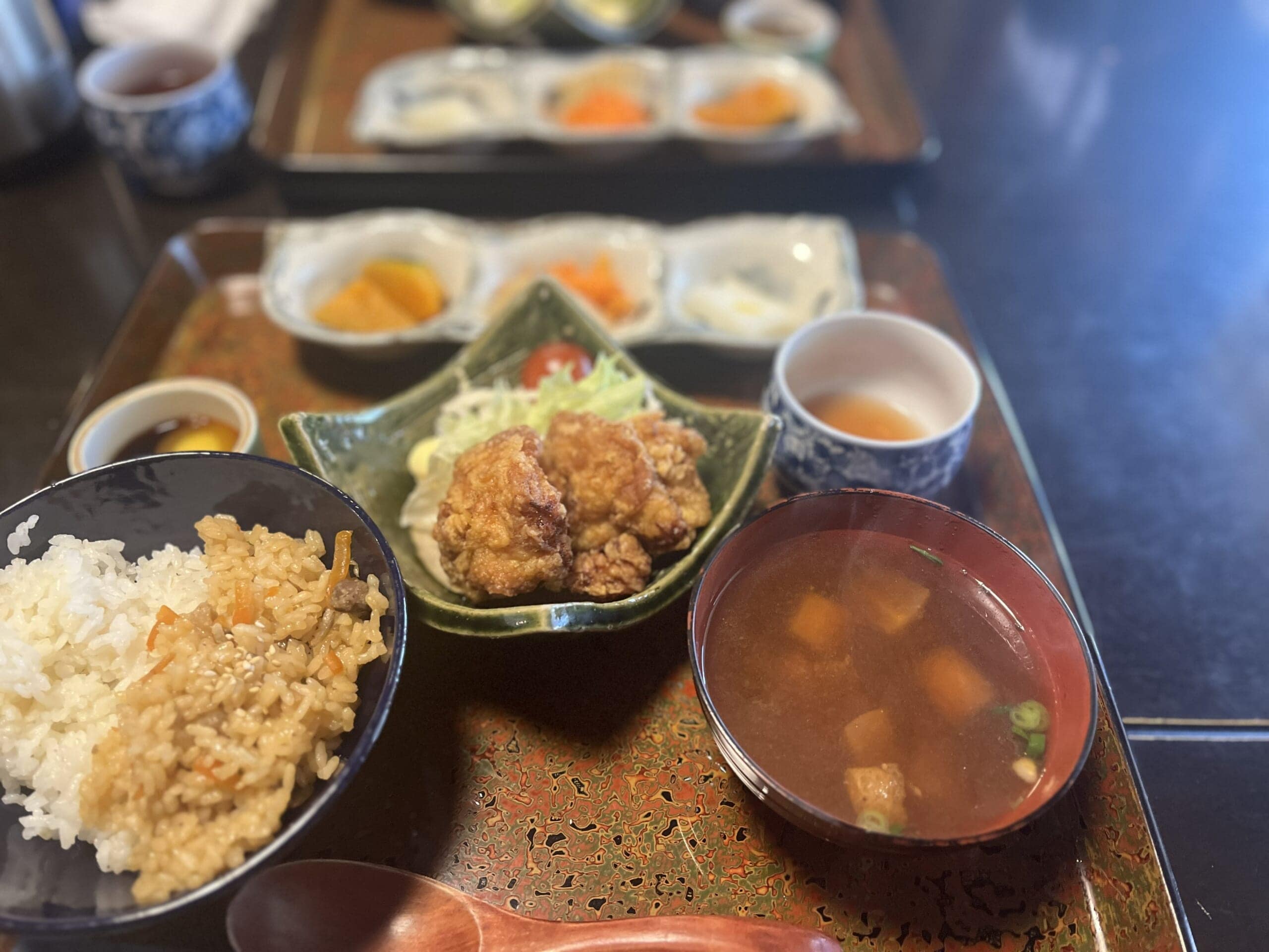 お昼ごはんは、梅林公園から車で15分程のかまど焚きの美味しいお米が食べれるokudo中村舎さんで定食を頂きました。私が選んだのは『鶏の竜田揚げ定食』お米を味ご飯とのハーフにしました。お料理はひとつひとつ手が込んでいて、バランスがよく美味しく頂きました。家屋は築220年だそうで、かまどが置いてあり、かまど焚き体験もできるそうです。