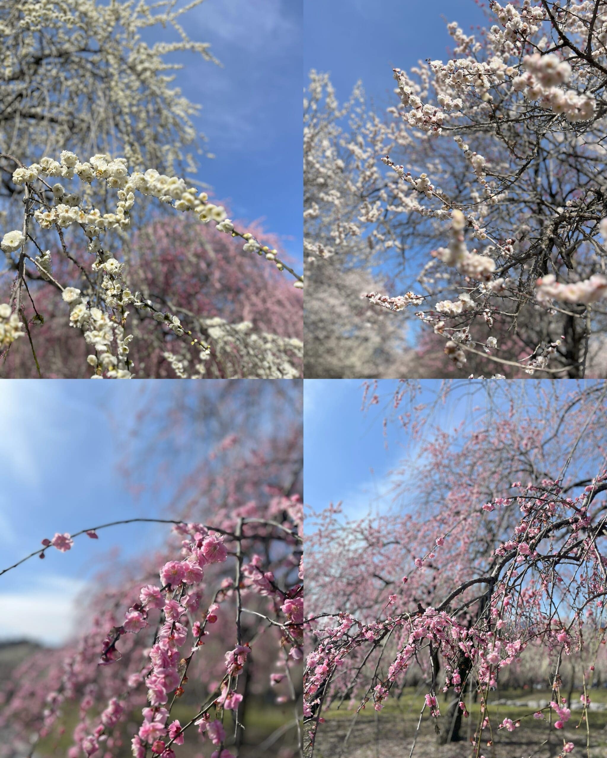 両親と妹と愛知県から車で1時間程のいなべ市へ行ってきました。目的は有名な梅林公園の梅祭り。平日だったからか、渋滞に巻き込まれることなく行けました~色とりどりの梅が並んでる光景は圧巻でした!小高い場所があり上から眺めたり近くで匂いを嗅いで可愛い花びらを見たり、近くに山が聳え立っているので、梅と山と青空のコントラストも綺麗でした。お土産に梅はちみつを購入しました。