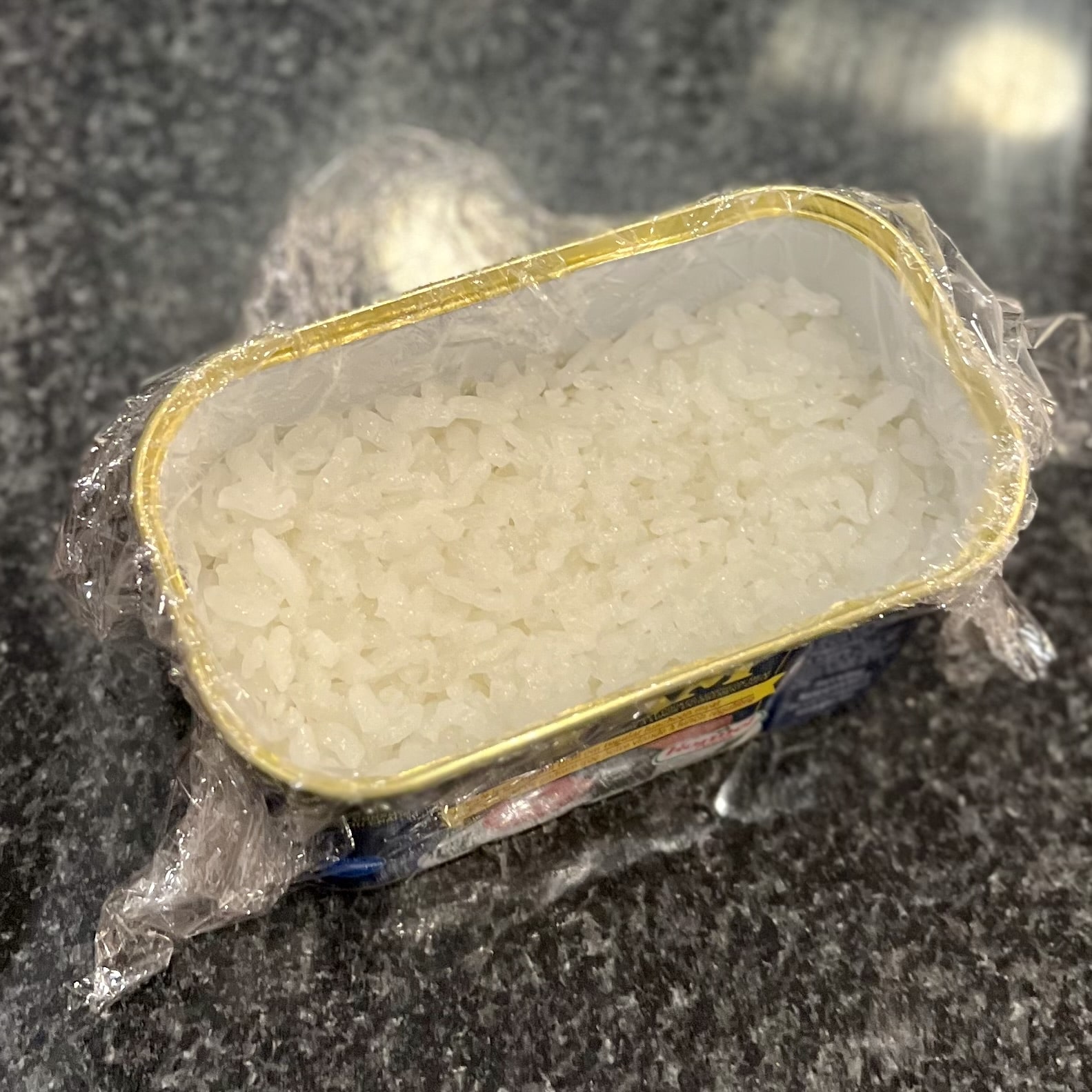 そして、ラップを敷いたスパム缶を型にしてご飯をぎゅっと詰め、スパムをのせて海苔で巻いたら♡