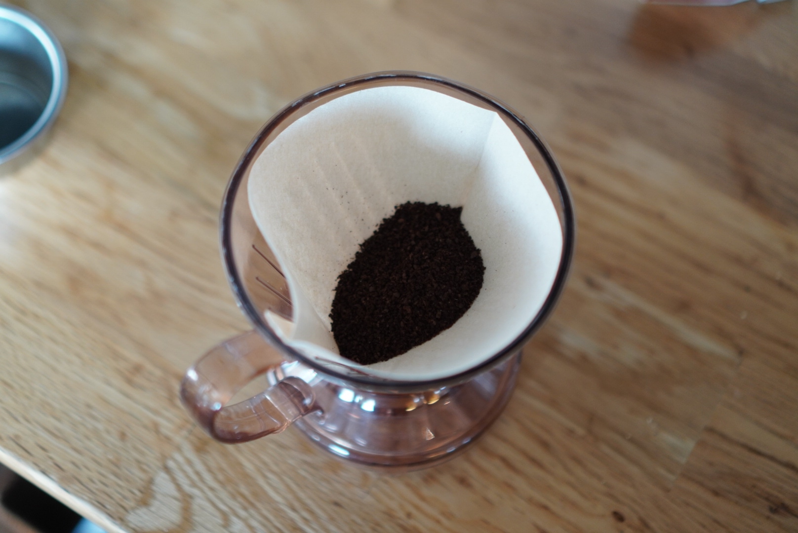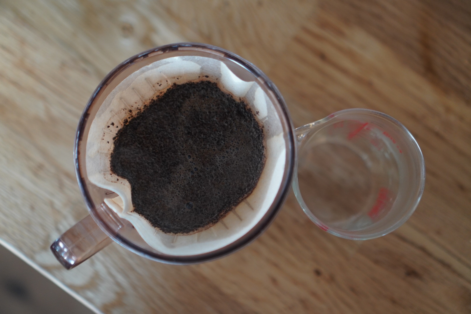 この時に注意するのが、決してカップやサーバーの上に置かないこと!(置くと弁が開いた状態になってお湯がそのまま落ちてしまうので)テーブルなどの平らなものの上でお湯を注ぎます。